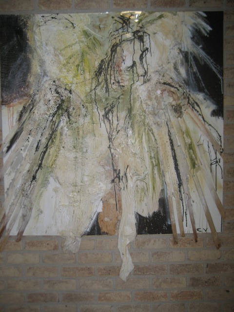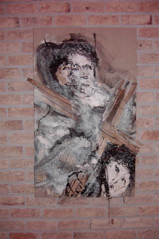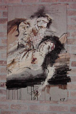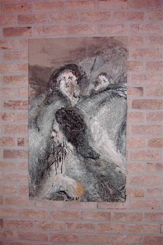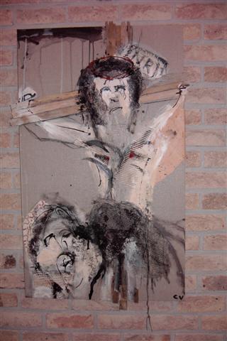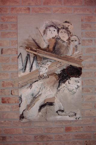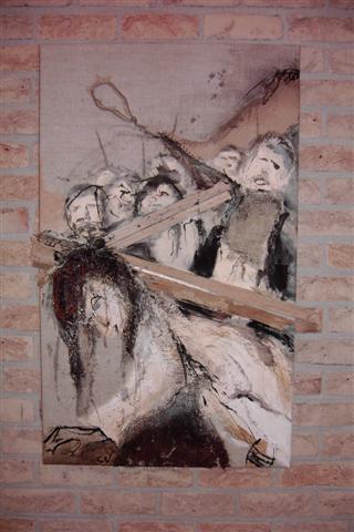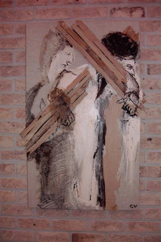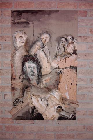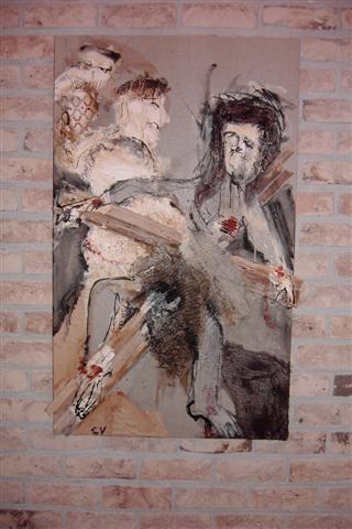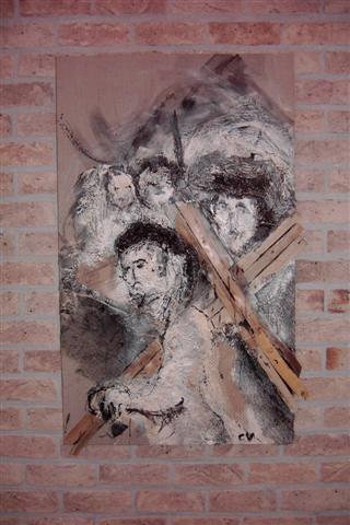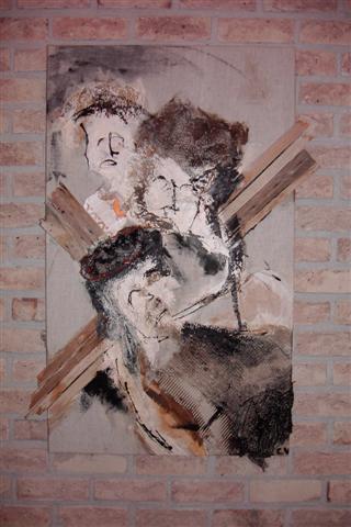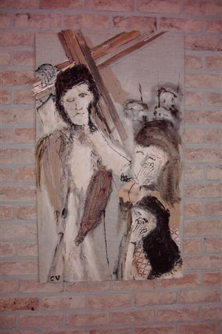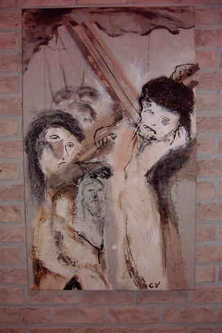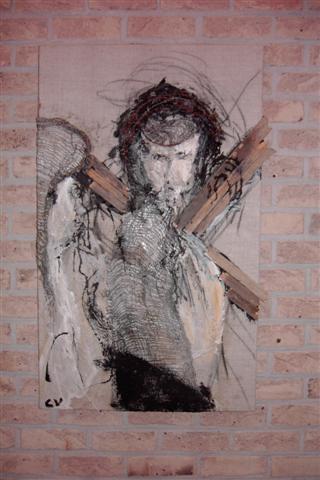 Kruisweg. De jongste jaren bestaat een hernieuwde belangstelling voor de kruisweg. In de vasten van 2004 werd het kruiswegontwerp van kunstenaar Carl Vandendaele uit Ronse opgehangen in onze kerk. Mede omdat onze kerk nog over geen kruisweg beschikte, kreeg die daar nadien - door een schenking van de kunstenaar - een vast onderkomen. De iconografie volgt het traditionele schema. Daarbij blijven de opeenvolgende staties herkenbaar, ondanks de vergaande expressionistische vervormingen. Doordat de Jezusfiguur, met zijn witte gelaat, er telkens anders uitziet, vervalt de kunstenaar nooit in stereotypen en winnen de composities nog aan kracht. Assemblagekunstenaar Vandendaele gebruikte acrylverf en recuperatiemateriaal, waaronder houten latten, staaldraad en hooi. De 'finishing touch' gebeurde met Oost-Indische inkt. Achteraf heeft de kunstenaar nog een vijftiende werk toegevoegd: De Verrijzenis Terug. St.-Pieter startpagina |