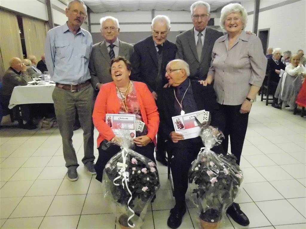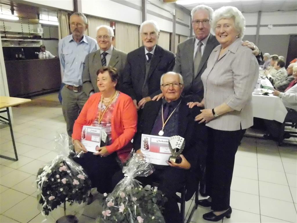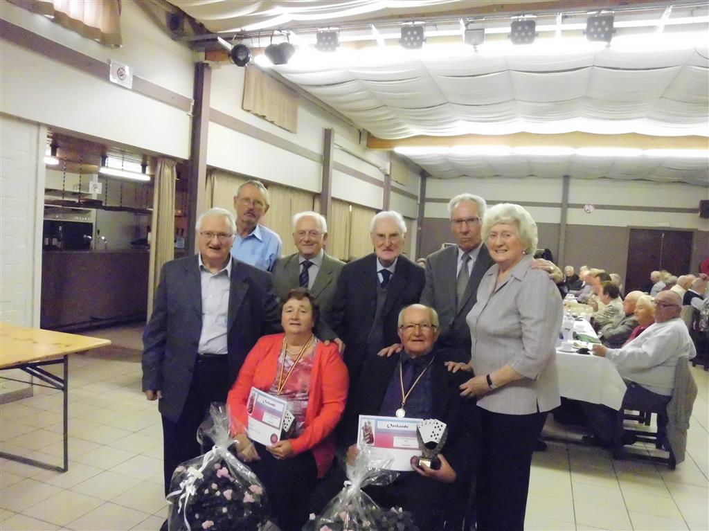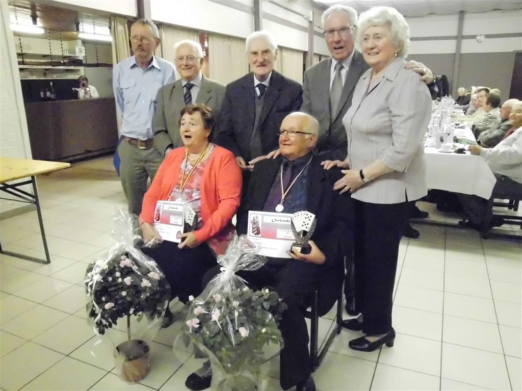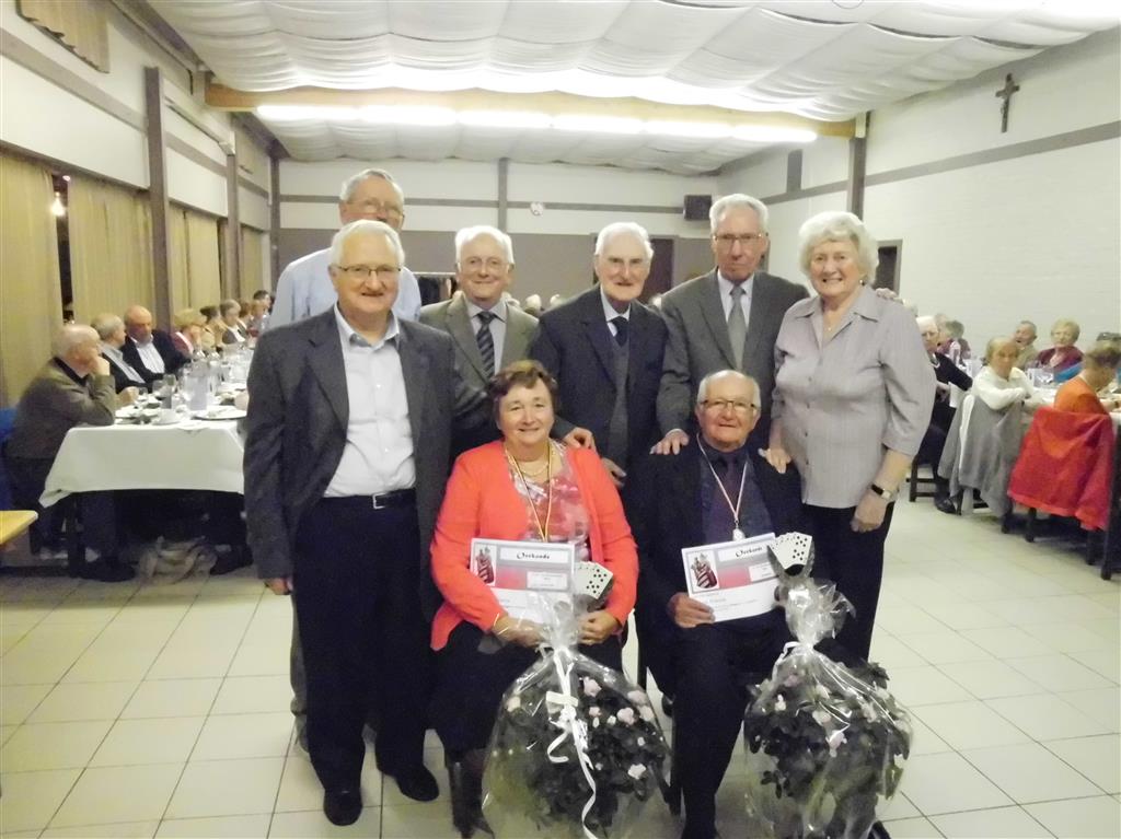 Kaartersclub 'St.-Pieter '. KAARTERS HULDIGEN KONINGSPAAR !Bij onze kaartersclub was er na 11 maanden kaarten, even de tijd om te ontspannen. Alle kaartersvrienden zakten af naar de parochiezaal 'De Spil' voor een fijn feestmaal ter afsluiting van het 23ste werkjaar. Dat bood ook de gelegenheid om het Kaarters-Koningspaar seizoen 2012-2013 toe te juichen: Koning Decock Etienne (met 214 punten) en Koningin Gerolfs Jeannette (met 105 punten). Zij worden geruggesteund door een glunderend bestuur (foto). En verder wil iedereen er opnieuw bij zijn vanaf donderdag 14 november om 14 u. Nieuwe leden worden, zonder toelatingsexamen, met open armen opgewacht. Tot dan! Terug St.-Pieter startpagina |