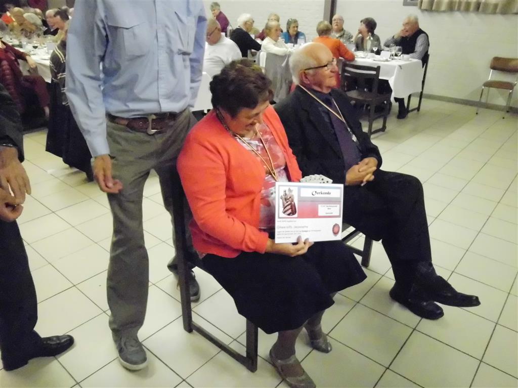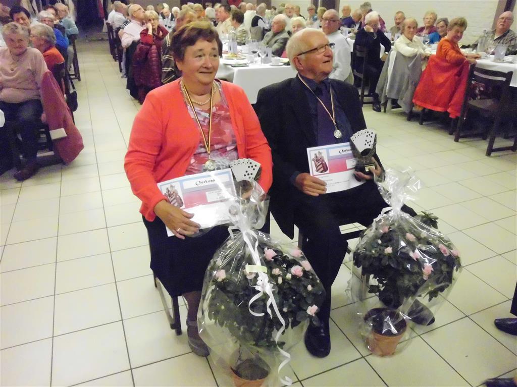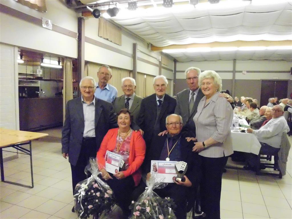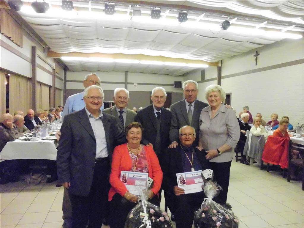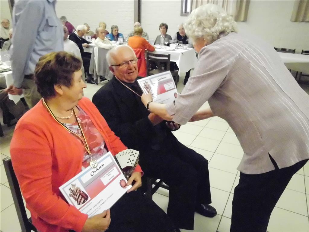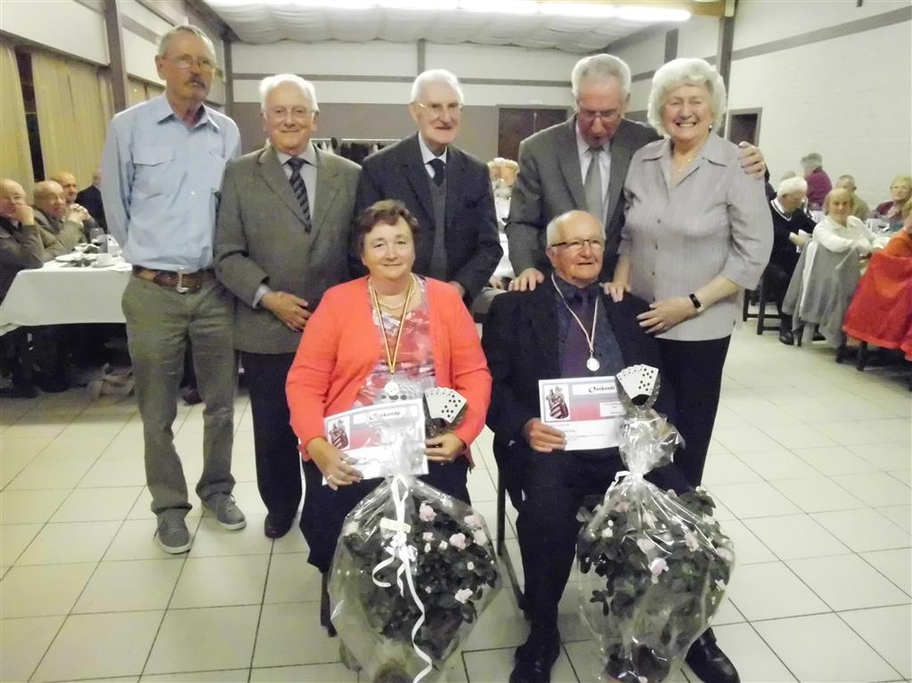 Kaartersclub 'St.-Pieter '. KAARTERS HULDIGEN KONINGSPAAR !Bij onze kaartersclub was er na 11 maanden kaarten, even de tijd om te ontspannen. Alle kaartersvrienden zakten af naar de parochiezaal 'De Spil' voor een fijn feestmaal ter afsluiting van het 23ste werkjaar. Dat bood ook de gelegenheid om het Kaarters-Koningspaar seizoen 2012-2013 toe te juichen: Koning Decock Etienne (met 214 punten) en Koningin Gerolfs Jeannette (met 105 punten). Zij worden geruggesteund door een glunderend bestuur (foto). En verder wil iedereen er opnieuw bij zijn vanaf donderdag 14 november om 14 u. Nieuwe leden worden, zonder toelatingsexamen, met open armen opgewacht. Tot dan! Terug St.-Pieter startpagina |