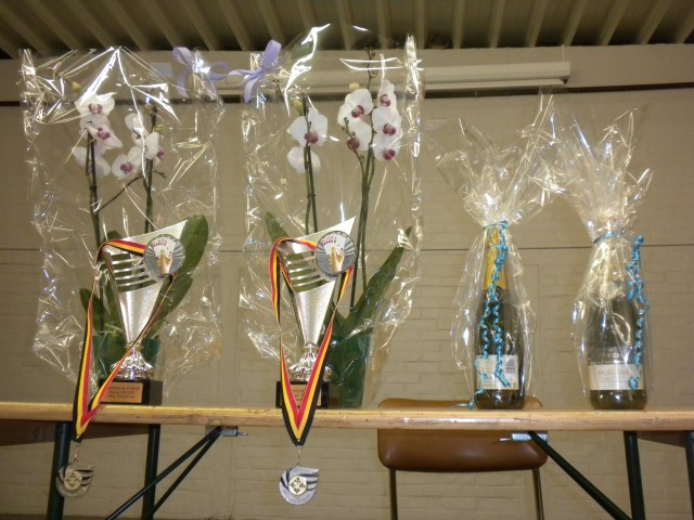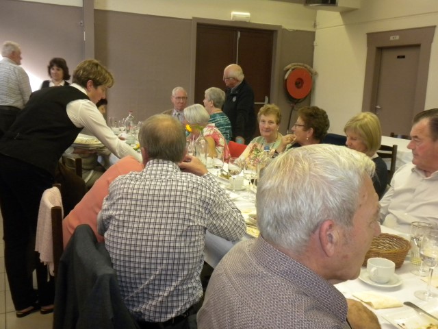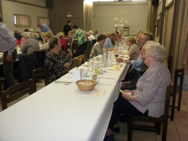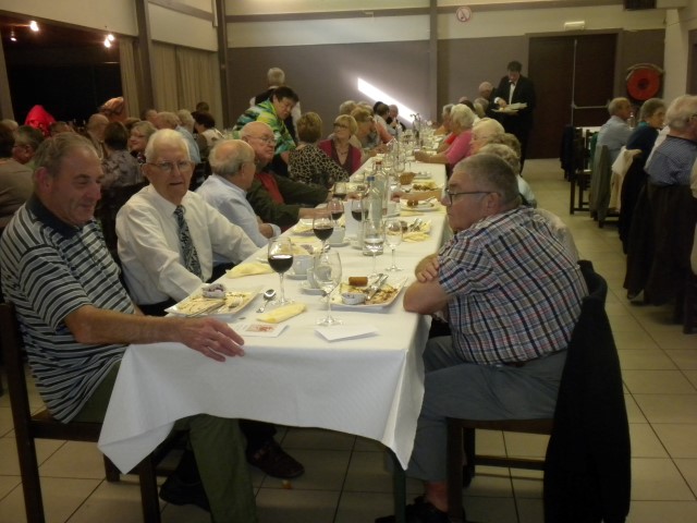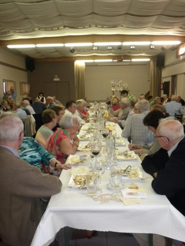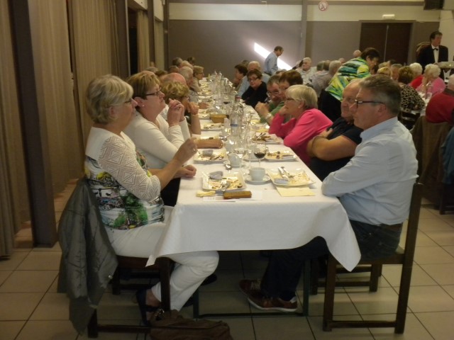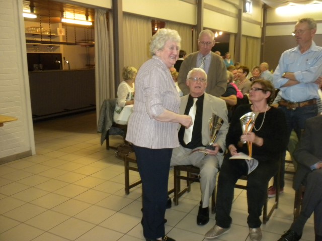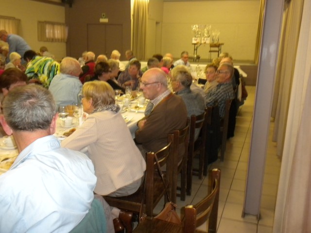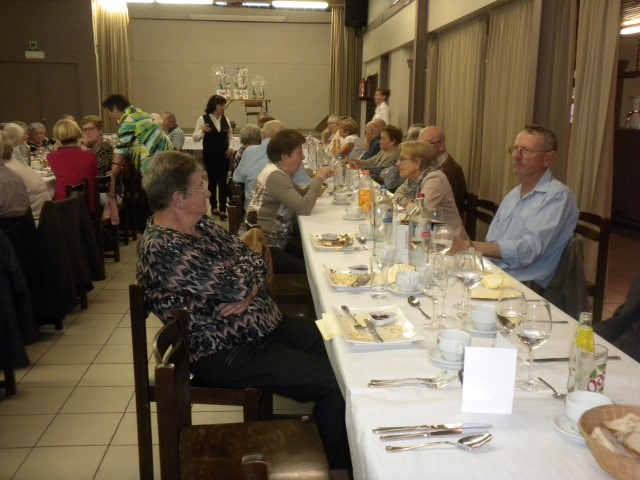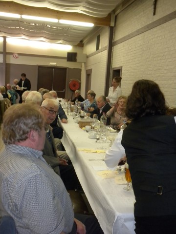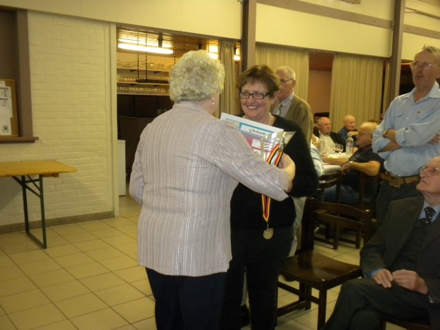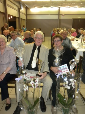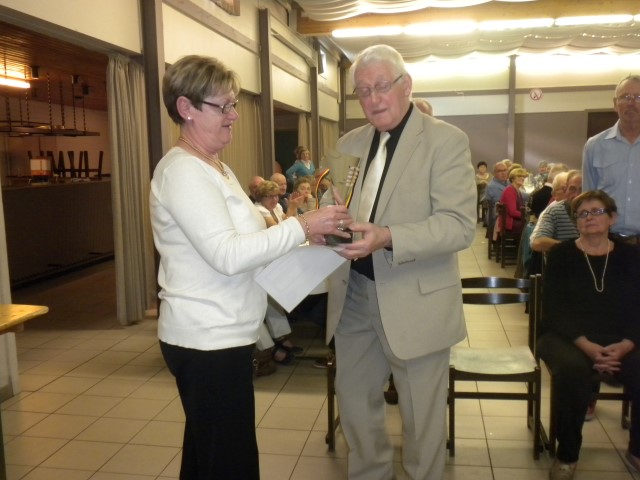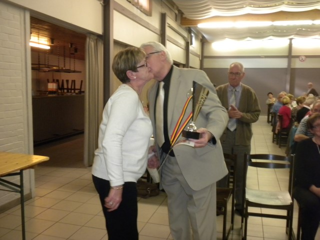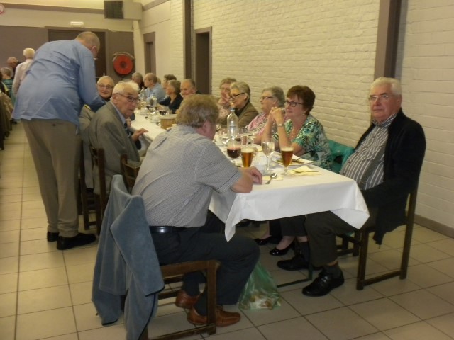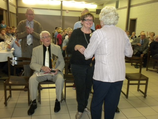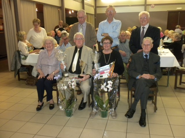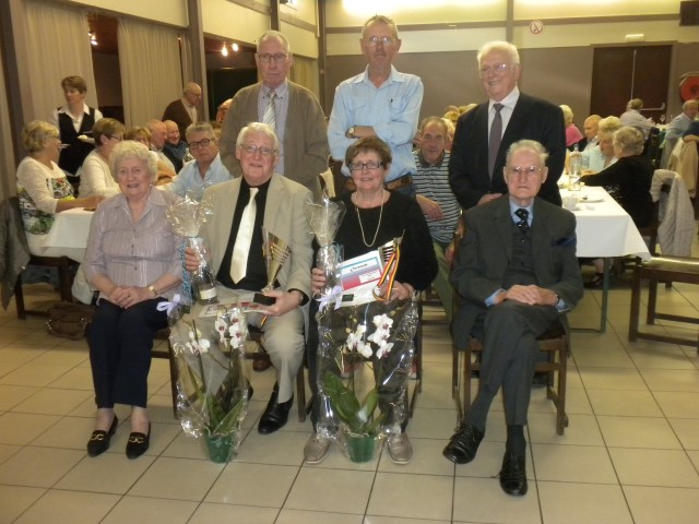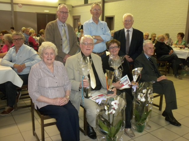 Kaartersclub 'St.-Pieter '. KAARTERS HULDIGEN KONINGSPAAR !Bij onze kaartersclub was er na 11 maanden kaarten, even de tijd om te ontspannen. Alle kaartersvrienden zakten af naar de parochiezaal 'De Spil' voor een fijn feestmaal ter afsluiting van het 24ste werkjaar. Dat bood ook de gelegenheid om het Kaarters-Koningspaar seizoen 2014-2015 toe te juichen: Koning (met 113 punten) en Koningin Vandeginste Rita (met 111 punten). Zij worden geruggesteund door een glunderend bestuur (foto). En verder wil iedereen er opnieuw bij zijn vanaf donderdag 12 november om 14 u. Nieuwe leden worden, zonder toelatingsexamen, met open armen opgewacht. Tot dan! Terug St.-Pieter startpagina |