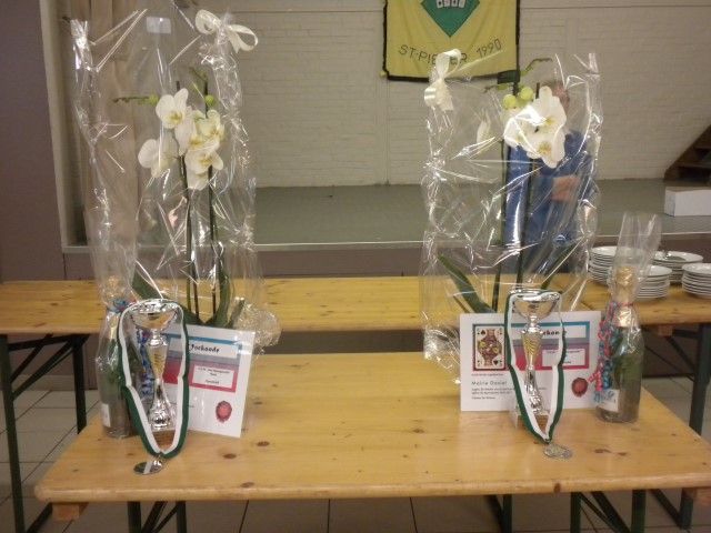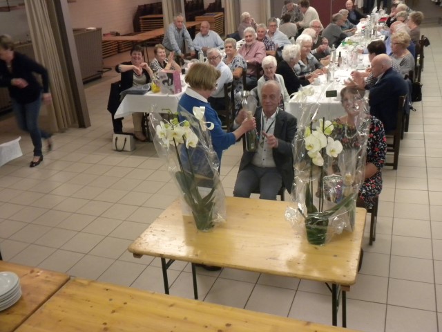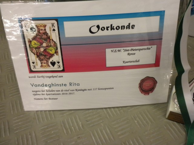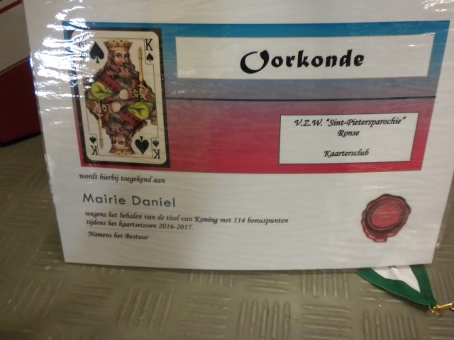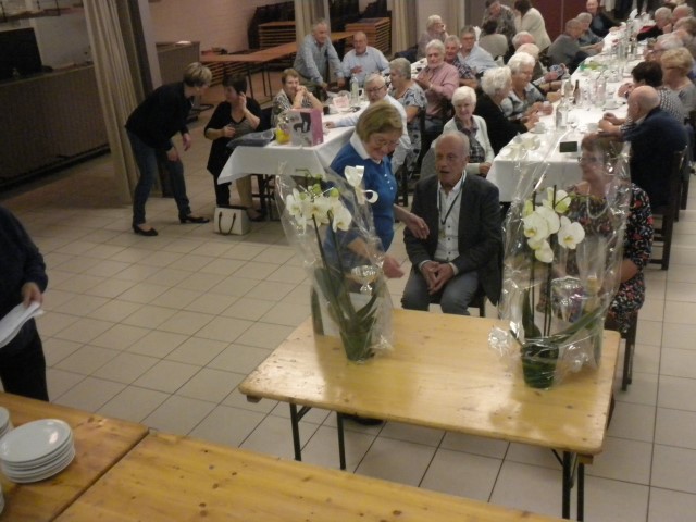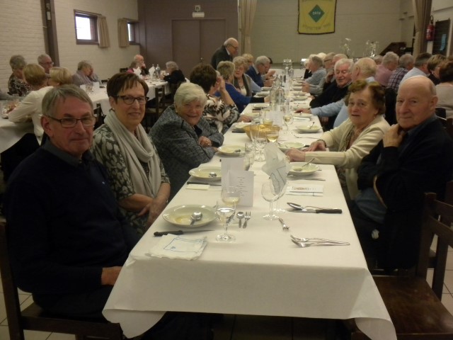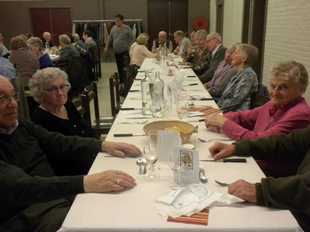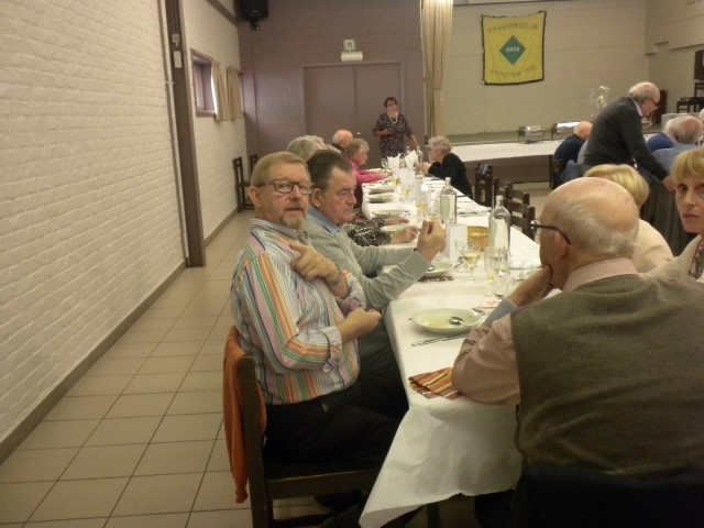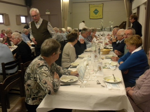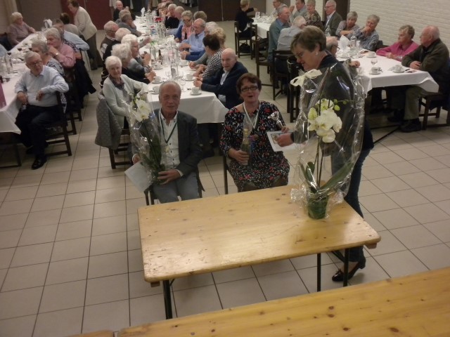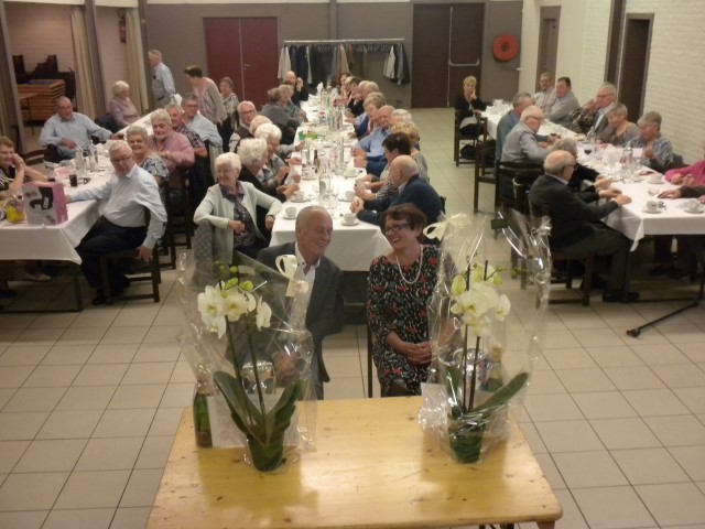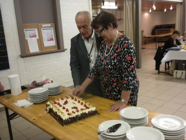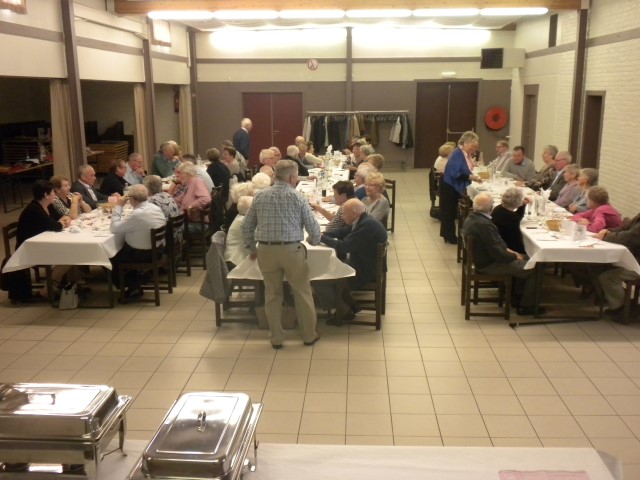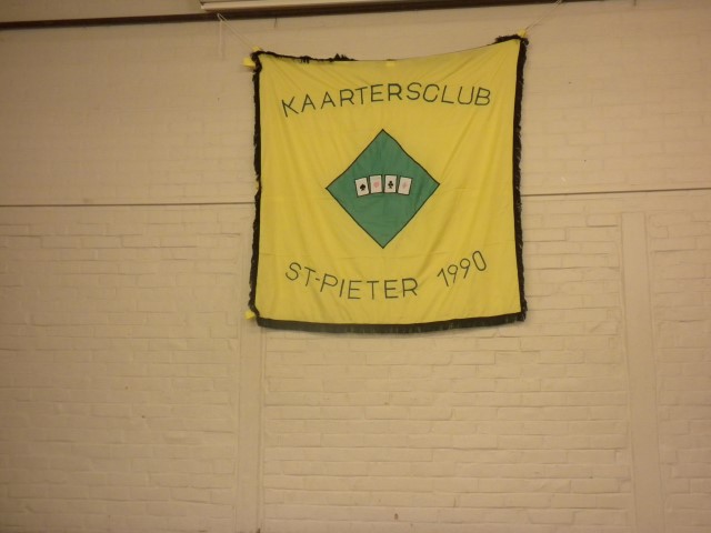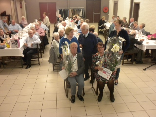 Kaartersclub 'St.-Pieter'. KAARTERS-KONINGSPAAR SNIJDT FEESTTAART AAN!Onze kaartersclub nam na een jaartje kaarten, even de tijd om te ontspannen. Alle kaartersvrienden zakten donderdag 12 oktober af naar de ‘Spil' voor een fijn feestmaal ter afsluiting van het 27ste werkjaar. Inderdaad, Henri Lammens meldde ons dat de kaartersclub werd gesticht in het jaar 1990. Na vele jaren als afgevaardigde binnen de VZW neemt hij eervol ontslag. Bij deze bedankt het VZW-bestuur voor de jarenlange inspirerende inzet. Dat zal hem niet beletten binnen de kaartersclub ten dienste te blijven. Tijdens de souper mochten seizoenskoning Daniel Marie (114 punten) en seizoenskoningin Rita Vandeghinste (117 punten) de feesttaart aansnijden. De eer is hun gegund en welverdiend. Donderdag 9 november om 14 u. is iedereen weer welkom voor het nieuwe kaartseizoen in de Spil. Terug St.-Pieter startpagina |