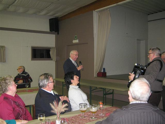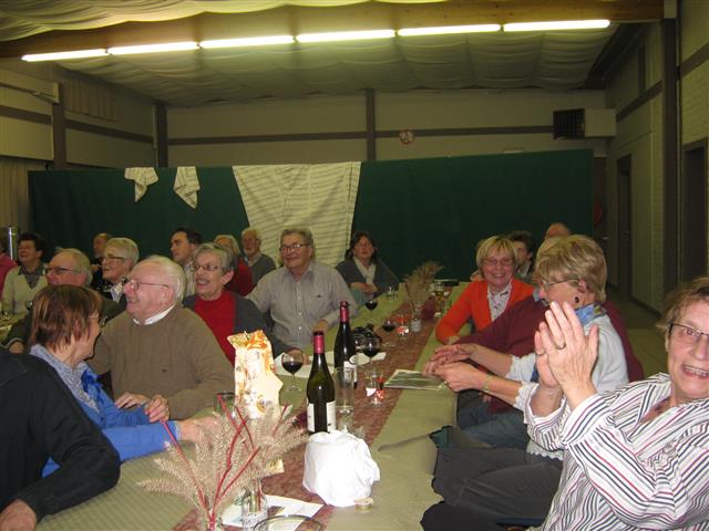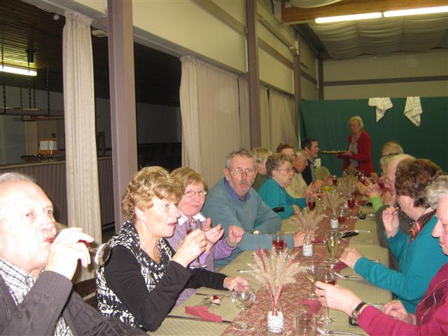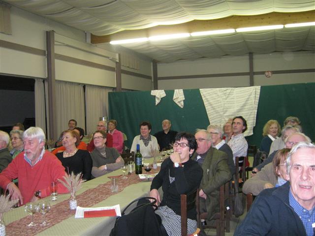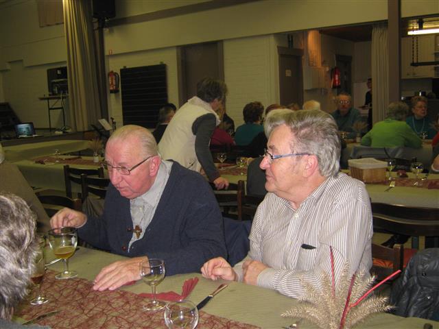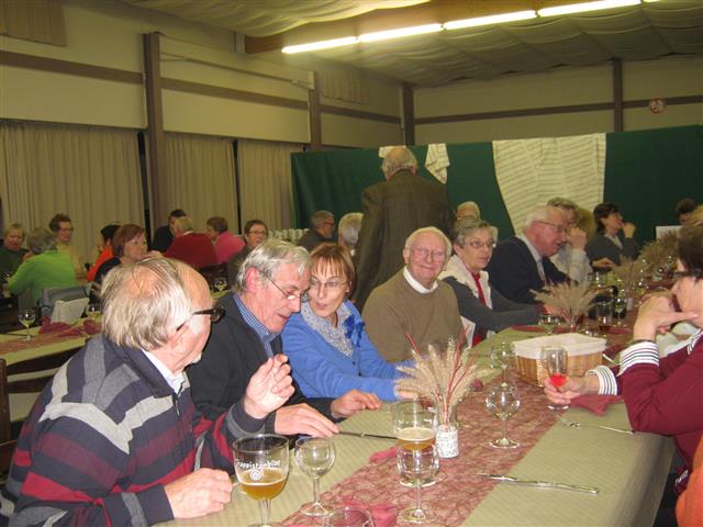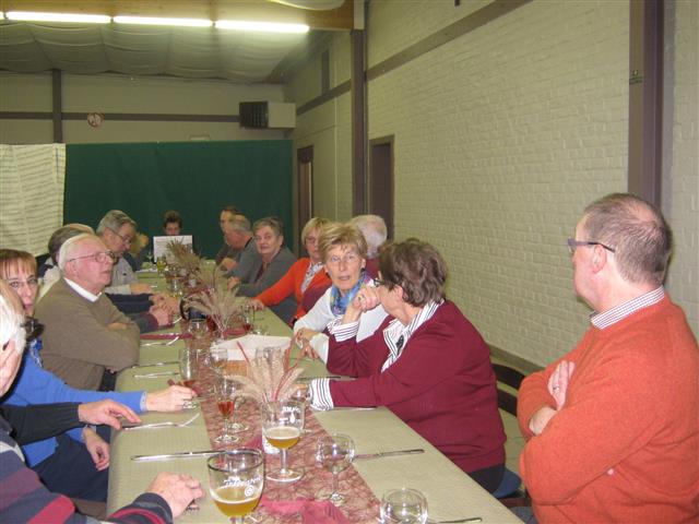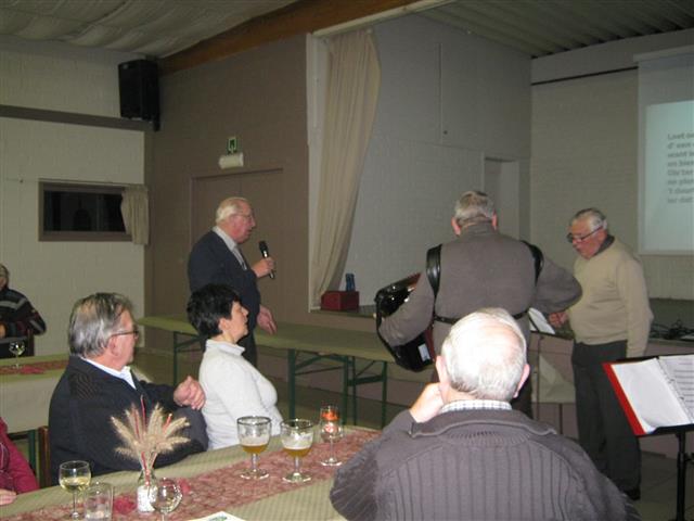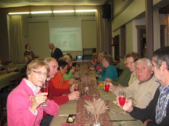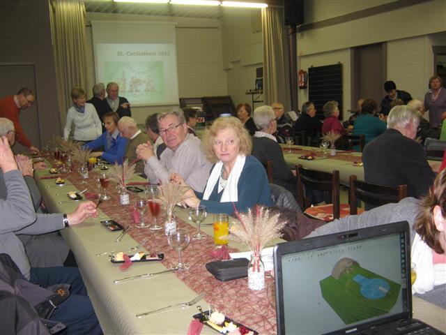 St.-Ceciliafeest 2013. CECILIAFEEST IN VOLLE HARMONIE. Vrijdag 22 november mochten de liturgische medewerkers weer aanschuiven voor een smakelijke souper in de Spil, ter gelegenheid van het jaarlijkse Ceciliafeest. Met een nieuwigheid! Ook de koorleden van de St.-Antoniusparochie deden mee. Pastoor André was duidelijk in zijn nopjes met dit ‘bilateraal’ initiatief. Zijn woorden van waardering voor onze koorwerking van zijn twee parochies kwamen recht uit het hart. Na het eten kregen wij een zeer gevarieerd liedjesprogramma door Jef, Dany en Roland. Rita zorgde voor een feilloze projectie van de teksten, die uit volle borst werden uitgezongen. De zangers van beide parochies lieten zich niet onbetuigd, net als hun enthousiaste herder. Dat alles in volle harmonie. Want zo kan het ook. Zo moet het eigenlijk. Samen sterk, twee-in-één! Met dank aan allen die de tafels en de zaal zo piekfijn hebben versierd, en het swingend muziekprogramma hebben klaargespeeld. St.-Pieter startpagina |