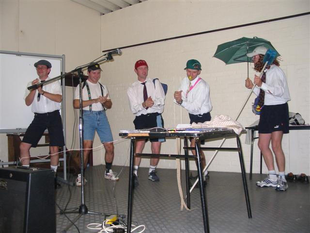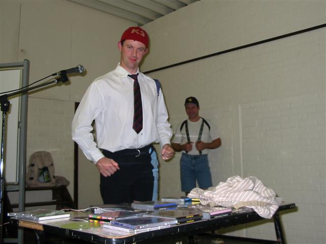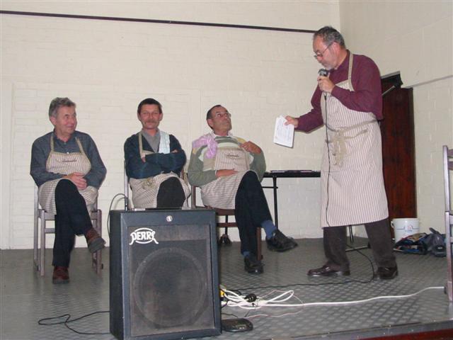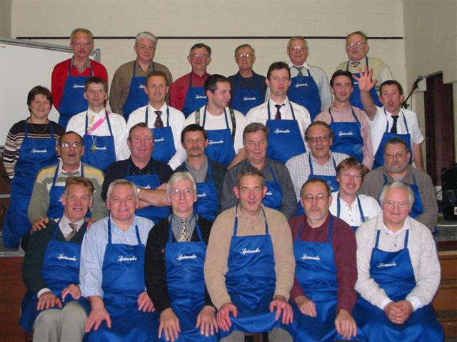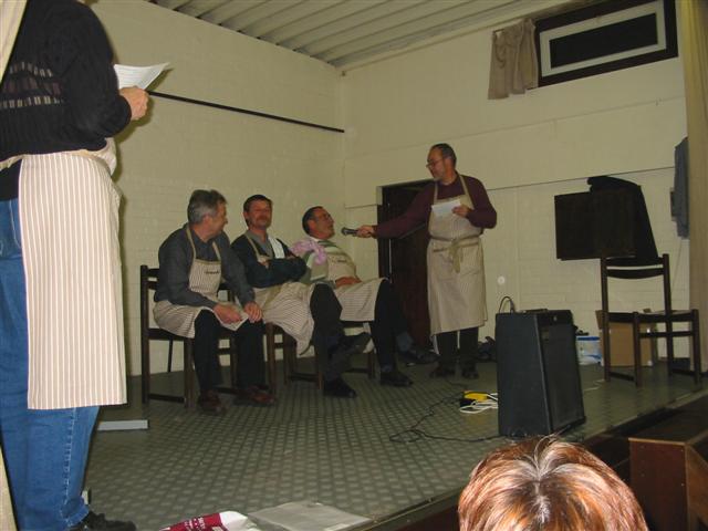 SPIMAKO : " DE MANNEN AAN HET WERK." De St.-Pieters-mannen-kookclub heeft op 10 november zijn werkzaamheden (tijdelijk) opge'schort’. De 17de kookreeks werd met de nodige luister en ambiance afgesloten. De nagelnieuwe, wasbestendige schort (met waarmerk SPIMAKO), die de mannen bij de diploma-uitreiking mochten ontvangen, trekken ze nu even uit. Maar op het komende schoolfeest staat SPIMAKO weer paraat met de beenhesp. En in het najaar van 2005 is de 18de bijscholing al met hoofdletters in de agenda genoteerd! Spimako St.-Pieter startpagina |