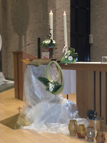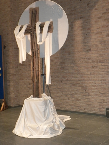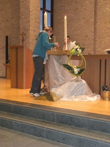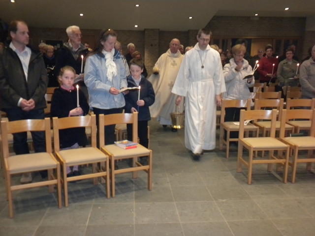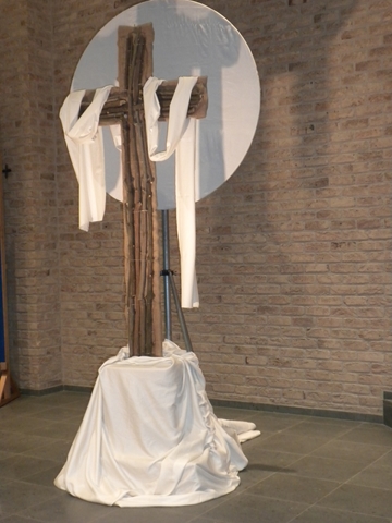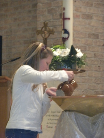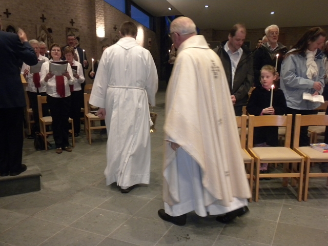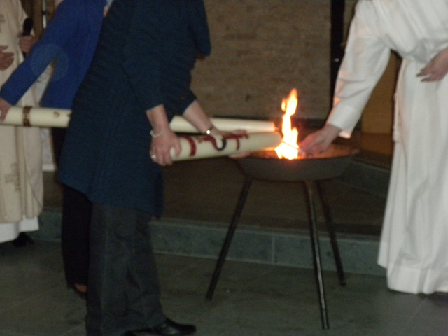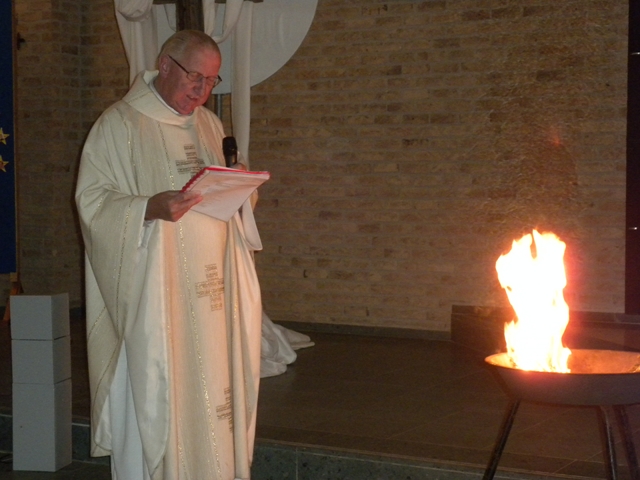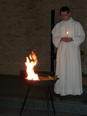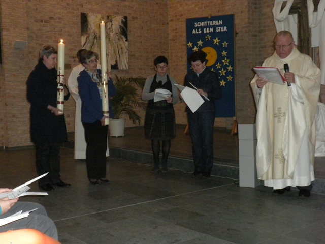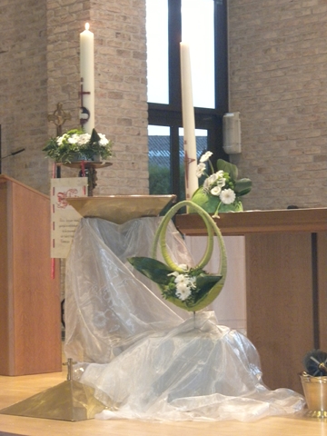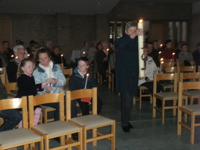 Paaswake 2012. "De Heer is verrezen. Alleluia!" Op paaszaterdag wordt de belangrijkste viering in de katholieke liturgie gehouden. Alle geloofselementen van het christendom komen sterk naar boven in de paaswake. Dit is de avond waarin zovelen gedoopt werden en worden, radicaal kiezend voor Jezus om Hem na te volgen. Het is de avond van het licht, Jezus, Licht van de wereld. Zijn kruis wordt verheven en getooid. In Zijn verrijzenis wordt duidelijk hoezeer Zijn boodschap mensen redding brengt. Niet Zijn dood telt, maar Zijn opstanding. "Zoek Hem bij de doden niet. De Heer is waarlijk opgestaan." In de paasnacht worden de liturgie van het vuur en van het water gevierd. De paaskaars wordt opnieuw ontstoken aan het paasvuur. Zo zal de verrezen Christus weer tussen ons staan. In de liturgie van het water wordt het doopwater gewijd en in de geest van het doopsel hernieuwen de gelovigen hun doopbeloften. Paaswake St.-Pieter startpagina |