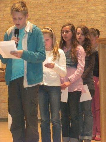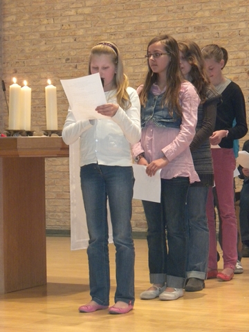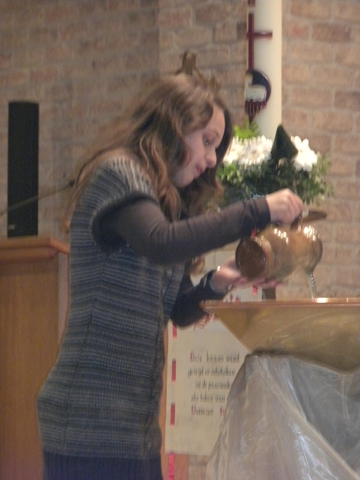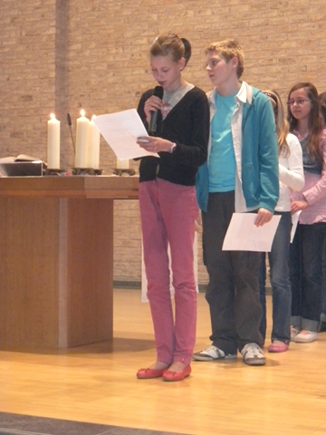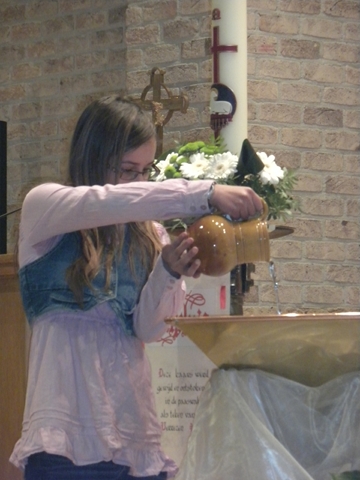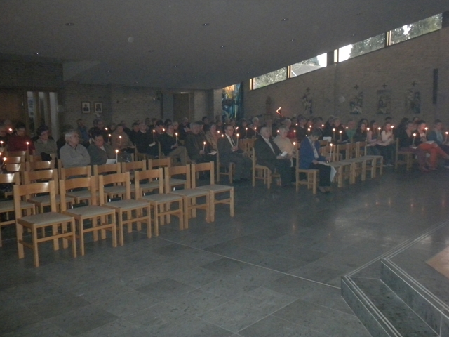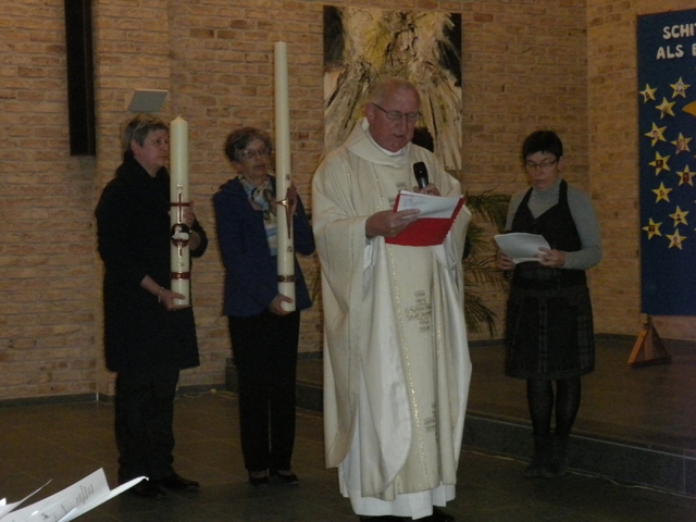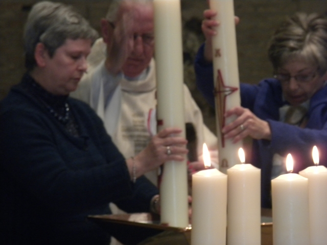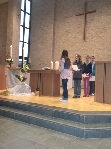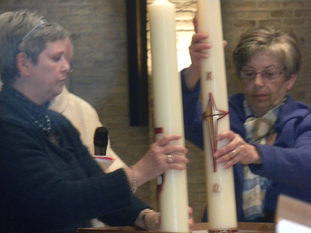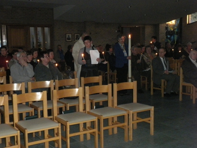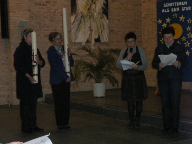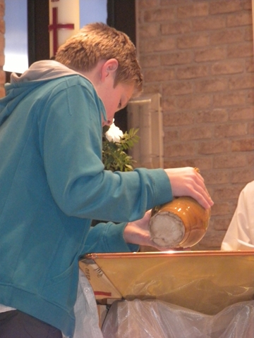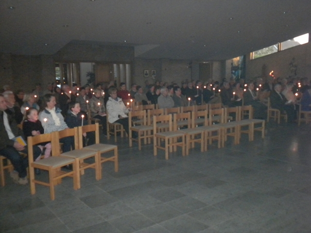 Paaswake 2012. "De Heer is verrezen. Alleluia!" Op paaszaterdag wordt de belangrijkste viering in de katholieke liturgie gehouden. Alle geloofselementen van het christendom komen sterk naar boven in de paaswake. Dit is de avond waarin zovelen gedoopt werden en worden, radicaal kiezend voor Jezus om Hem na te volgen. Het is de avond van het licht, Jezus, Licht van de wereld. Zijn kruis wordt verheven en getooid. In Zijn verrijzenis wordt duidelijk hoezeer Zijn boodschap mensen redding brengt. Niet Zijn dood telt, maar Zijn opstanding. "Zoek Hem bij de doden niet. De Heer is waarlijk opgestaan." In de paasnacht worden de liturgie van het vuur en van het water gevierd. De paaskaars wordt opnieuw ontstoken aan het paasvuur. Zo zal de verrezen Christus weer tussen ons staan. In de liturgie van het water wordt het doopwater gewijd en in de geest van het doopsel hernieuwen de gelovigen hun doopbeloften. Paaswake St.-Pieter startpagina |