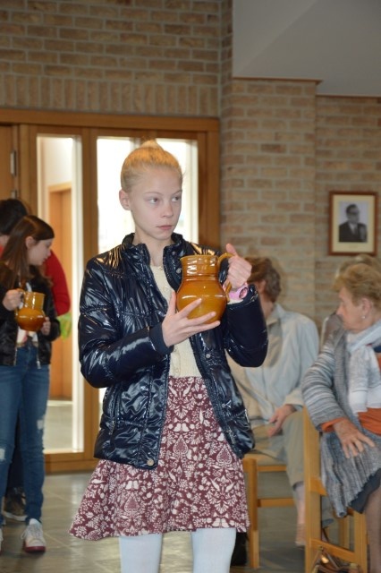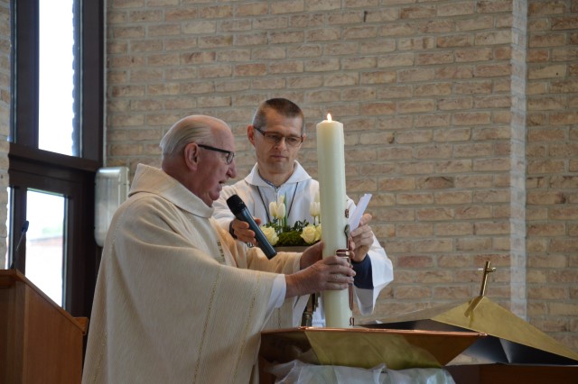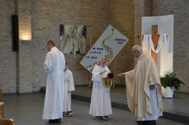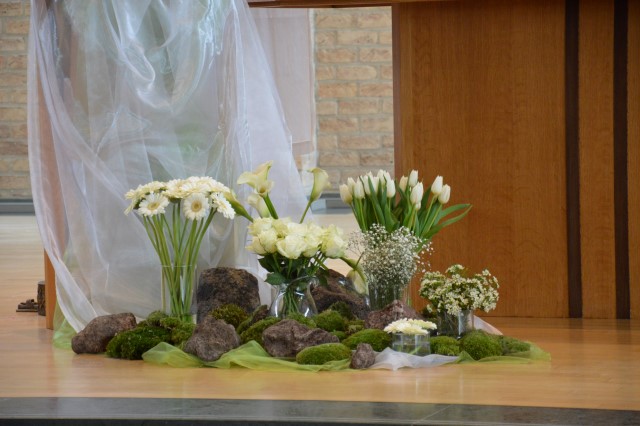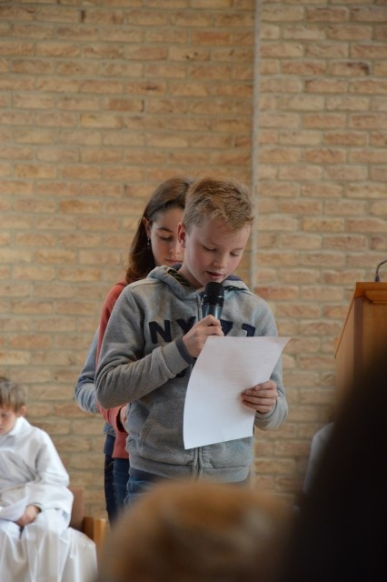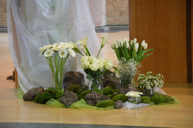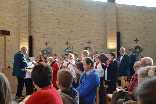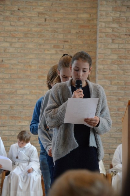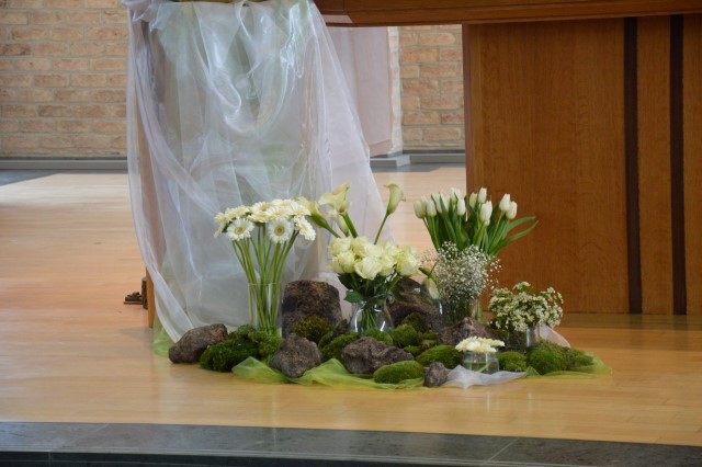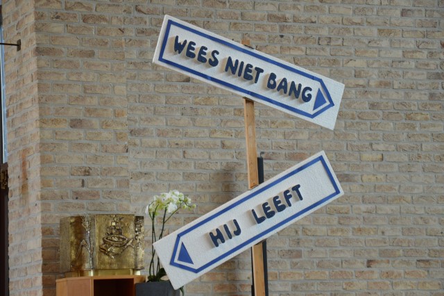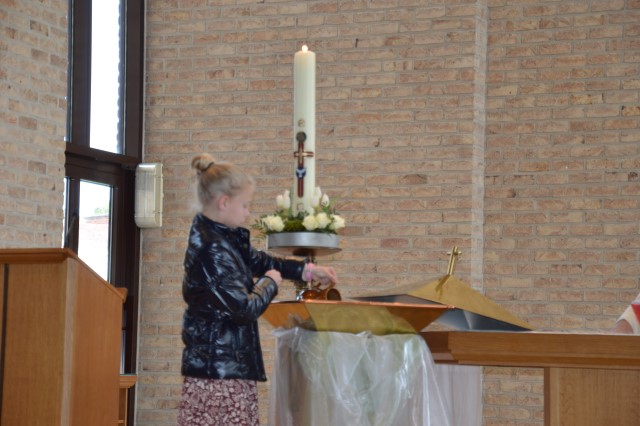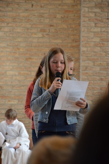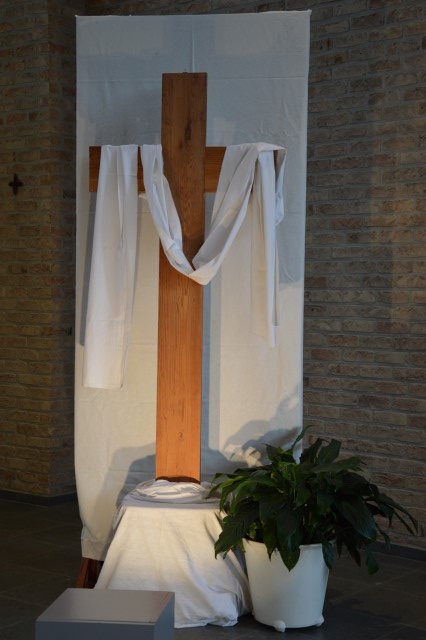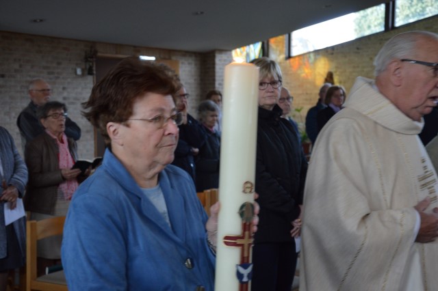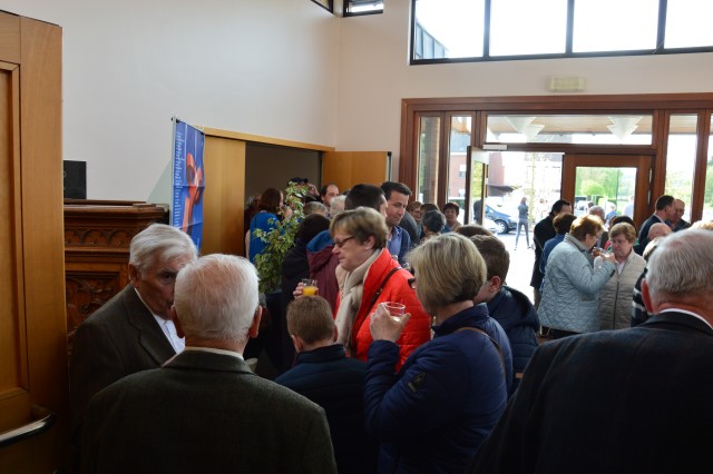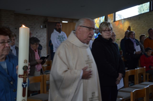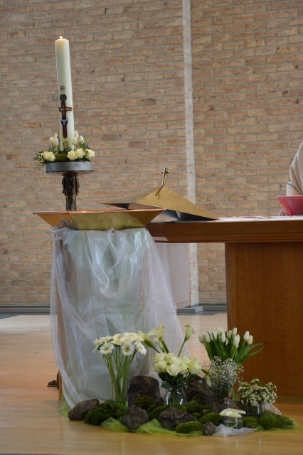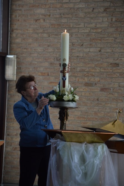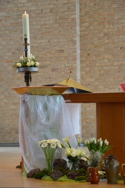 FEEST VAN JEZUS’ VERRIJZENIS. Paasmorgen. 9 u. Het St.-Pieterskoor “kondigt het jubelend aan†in een meerstemmige en gevarieerde zetting van het bekende lied. Sterke teksten, authentieke paasliederen en een symbool-rijke decoratie versiering kruiden de feestelijke paasviering. In de inleiding klinken hoopvolle woorden: God heeft ons in Jezus laten zien dat het leven sterker is dan de dood, dat de liefde het kwaad overwint. Omdat ons verstand dat niet zomaar kan vatten lieten wij ons in de viering meenemen door de getuigenissen van Maria Magdalena door het woord van Petrus. Daarom kunnen wij met overtuiging onze doopbeloften hernieuwen en ons laten besprenkelen met het nieuwe doopwater, aangebracht door onze vormelingen. Tot ieders voldoening was er een goede opkomst en bijval. Dat heeft ook de hele liturgische groep en met name ook het koor mogen ervaren. Een echte paaservaring. Na de viering kon de gelovige gemeenschap nog prettig gezellig bijpraten tijdens een welverdiende receptie. St.-Pieter startpagina |
