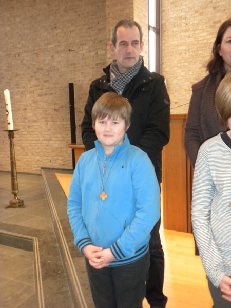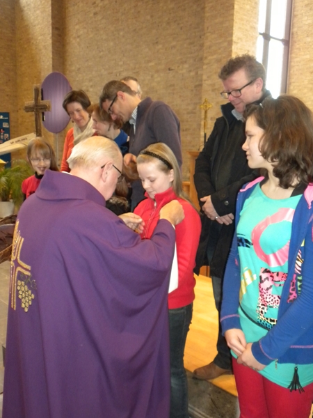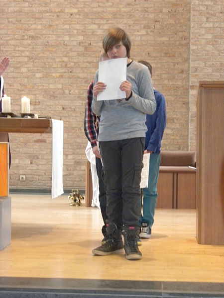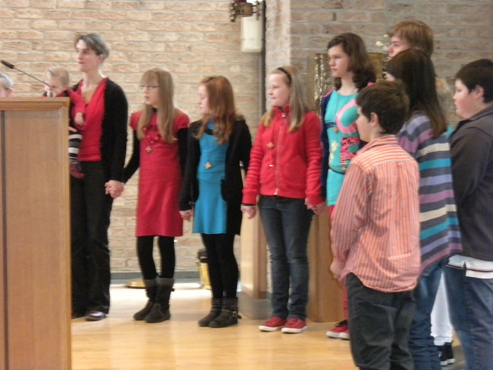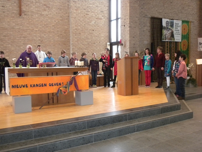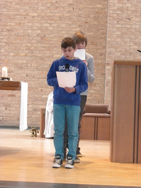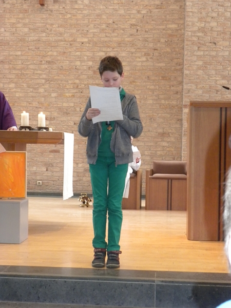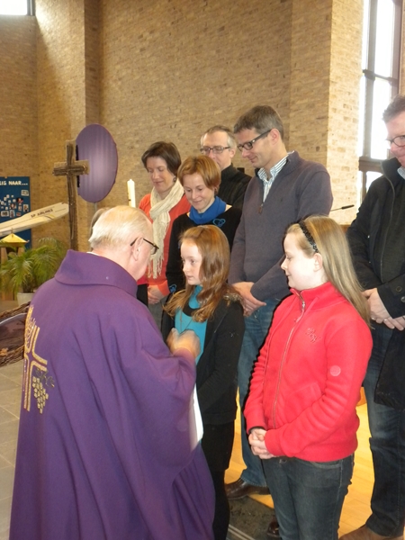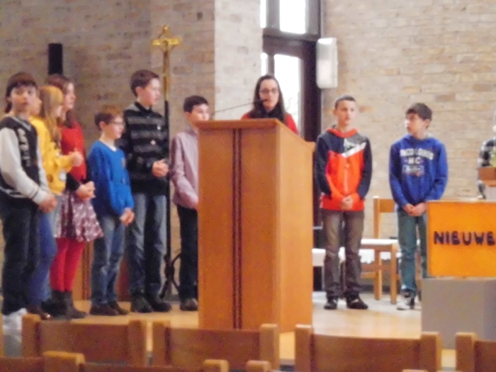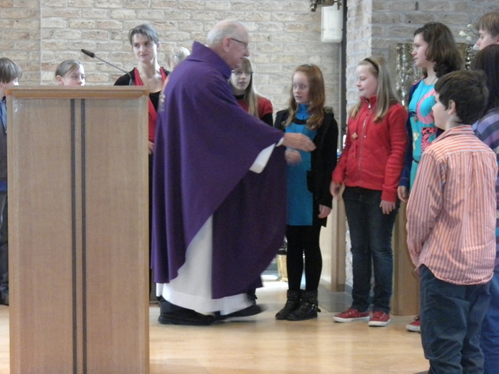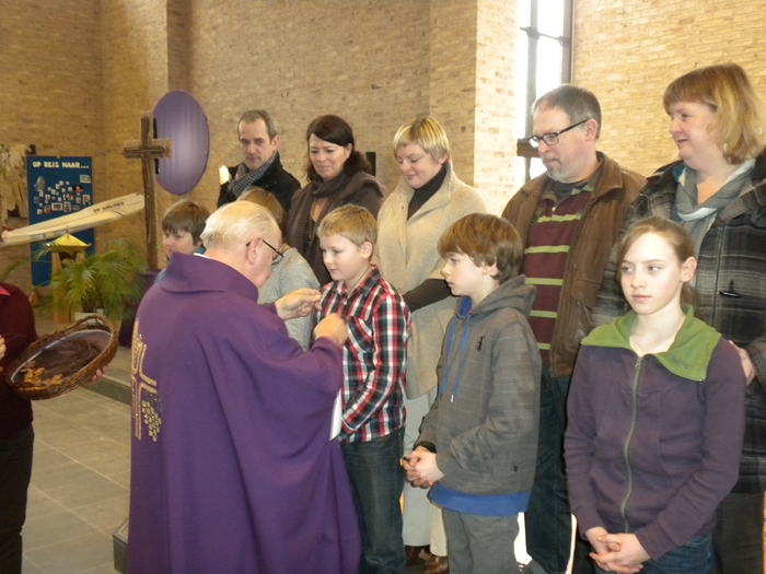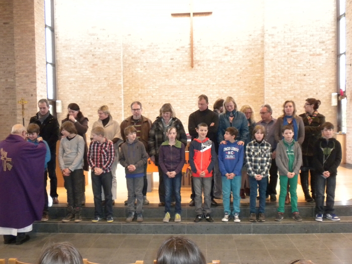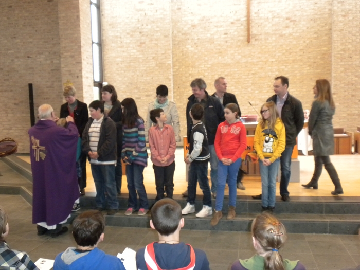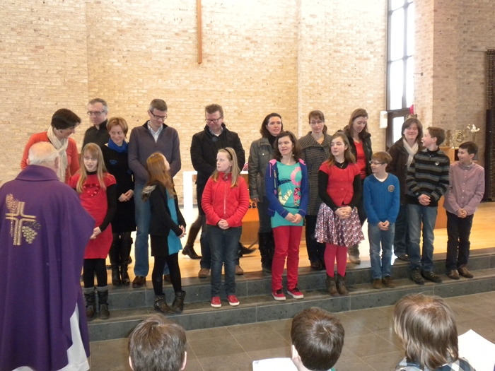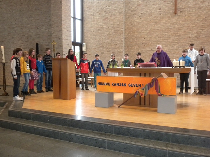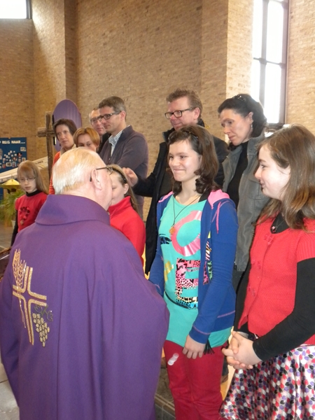 VLIEG MET ONS MEE… Zo zongen onze vormelingen het de voorlaatste keer uit in hun themalied t.g.v. de kruisjesgave. Tijdens de viering ontvingen zij het waarmerk van hun christelijk engagement: het kruisje. Dat herinnert hen eraan dat zij op een “kruispunt” komen in hun leven. Het plaatst deze jongeren voor de keuze of ze de route die God voor hen gekozen heeft, ook echt willen volgen. Het kruis (+) is ook een pluspunt: een teken dat we mensen bij elkaar willen optellen, en dat iedereen meetelt. 'Plus' wil ook zeggen: 'positief', en zo nodigt het kruisteken uit vooral het positieve in de wereld te zoeken, de positieve dingen een duwtje in de rug te geven. De viering verliep andermaal hartelijk, stijlvol en vlot. Wij werden geboeid, niet alleen door het ritueel, de teksten en liederen, Het samenzijn stond uiteraard in het teken van deze vastenactie: concreet gebeurde dit met een (eerste) collecte en de verkoop van knutselwerk door de vormelingen. Later brengen we het globale resultaat van al onze solidariteitsacties. St.-Pieter startpagina |