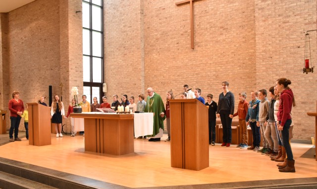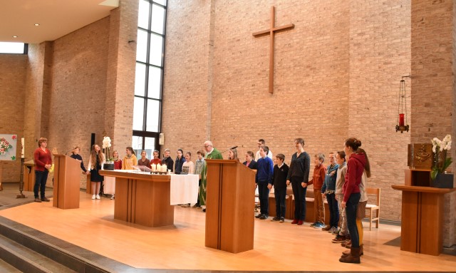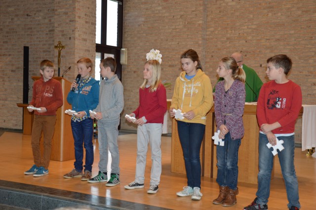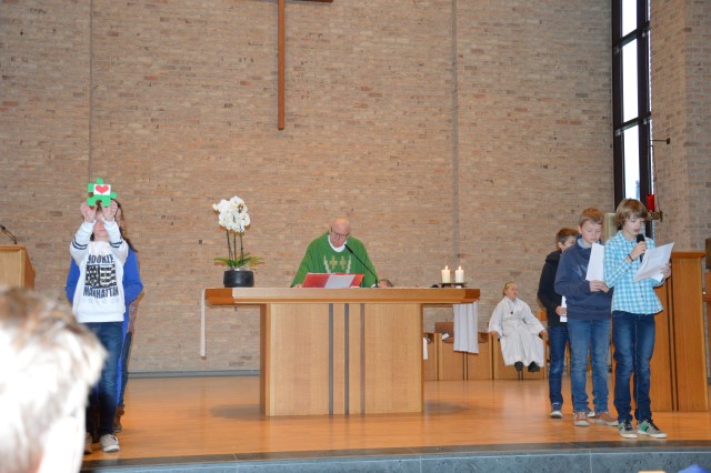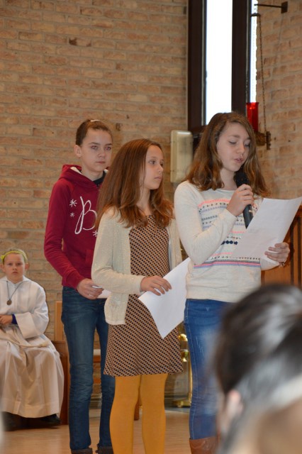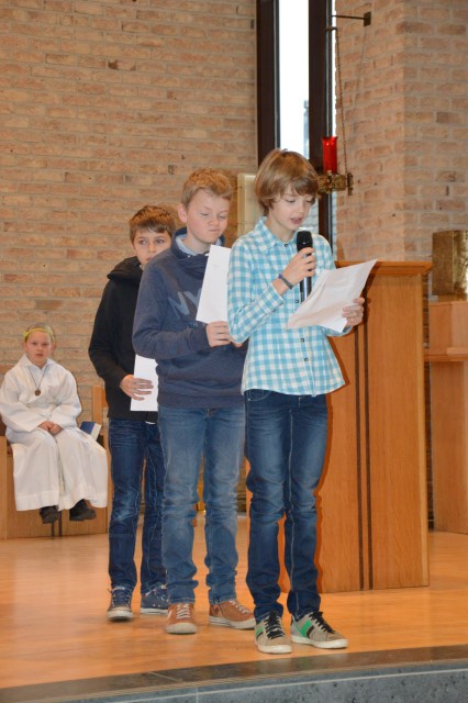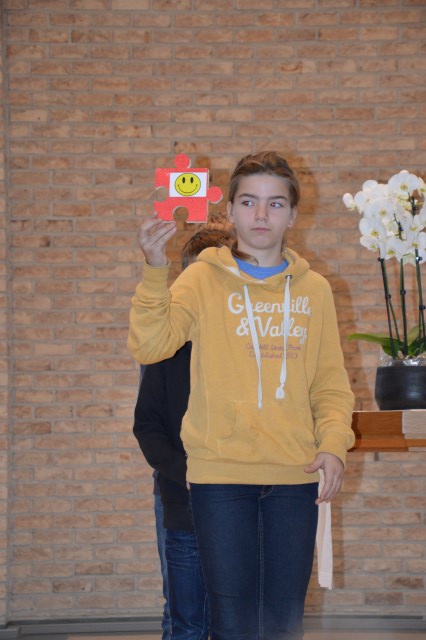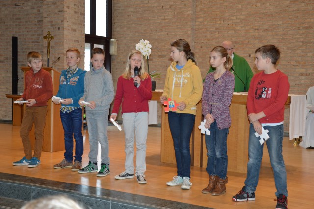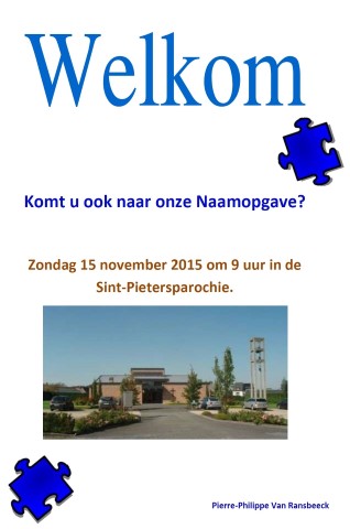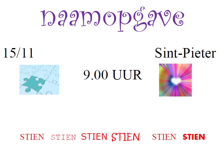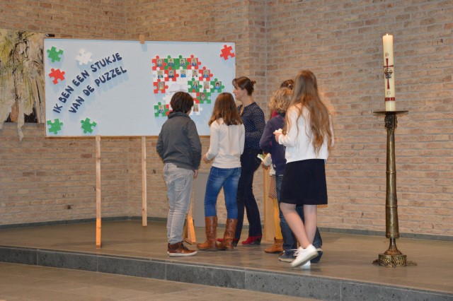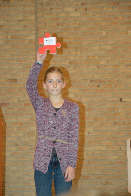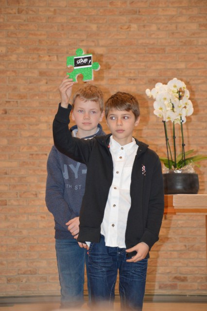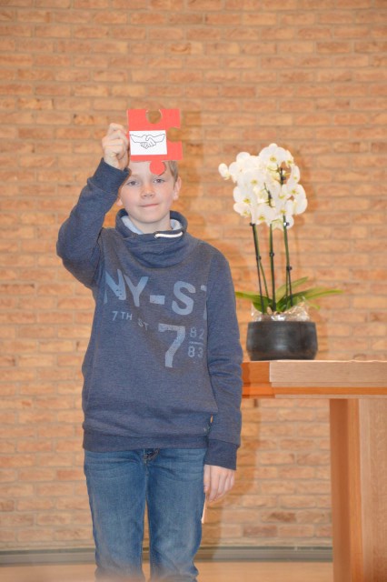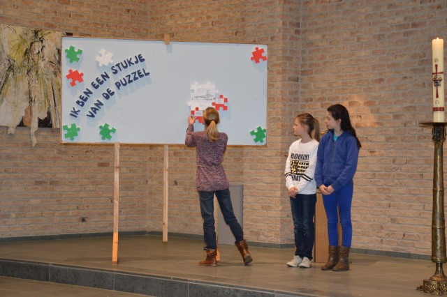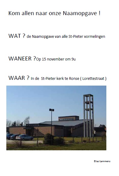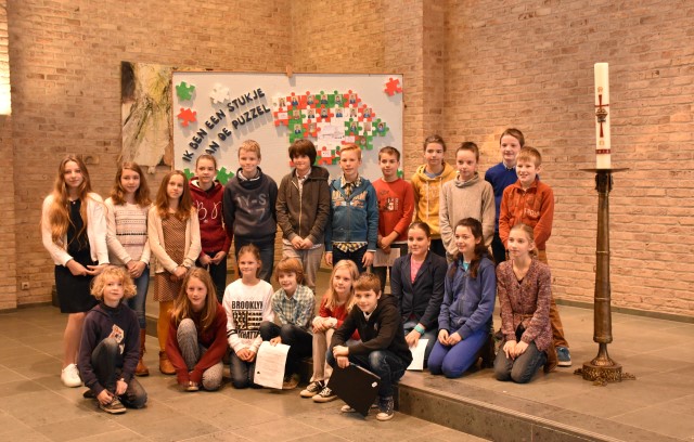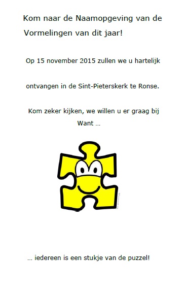 VORMELINGEN DEEL VAN PUZEL! Zondag 15 november lieten onze vormelingen-in-spe tijdens de viering van de naamopgave hun naam ook werkelijk blijgestemd horen aan alle aanwezigen in onze St.-Pieterskerk. Een eerste belangrijke stap op weg naar het Vormsel. Daarmee lieten ze zien dat ze bereid zijn Jezus te zoeken, en hun doopbeloften concrete gestalte te geven. De hele parochie-gemeenschap steunt hen en hun ouders bij deze belangrijke beslissing.Ze maakten alvast zelf een uitnodiging voor deze viering enkele voorbeelden vind je hier alvast. In naam van velen: dank en proficiat! St.-Pieter startpagina |