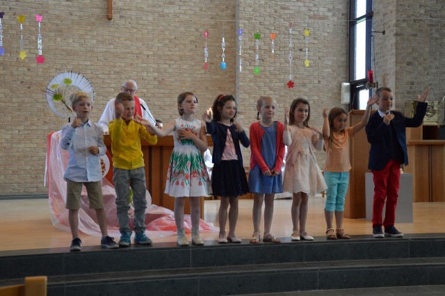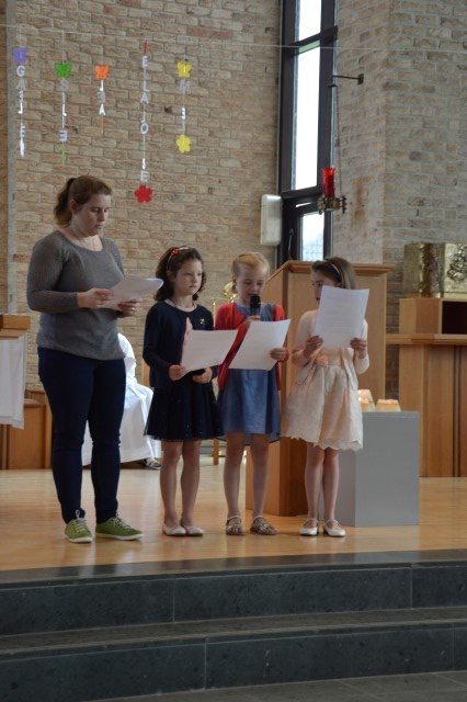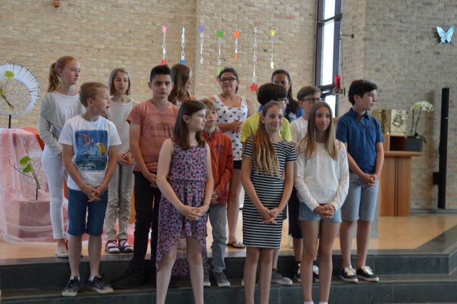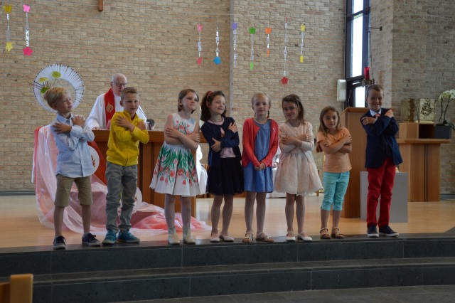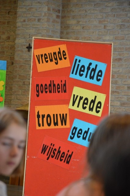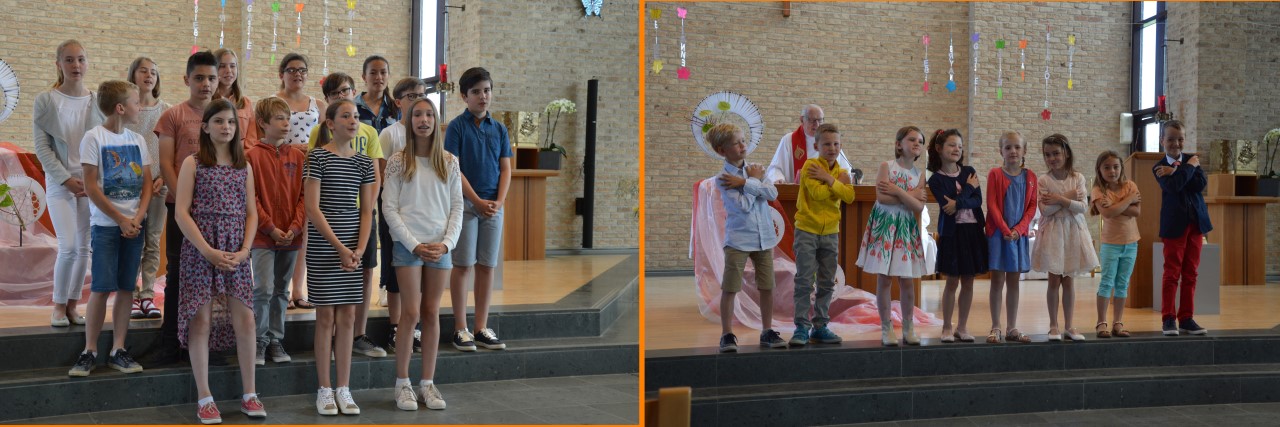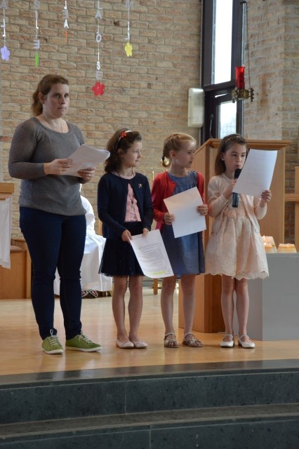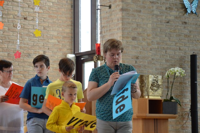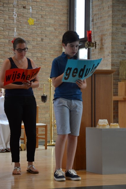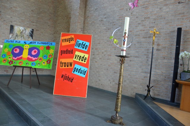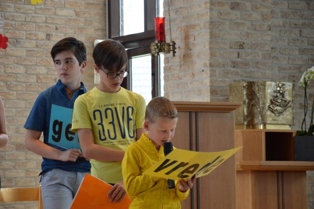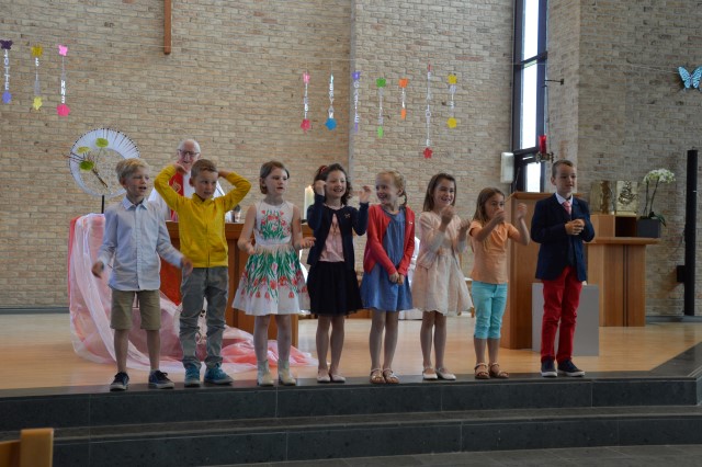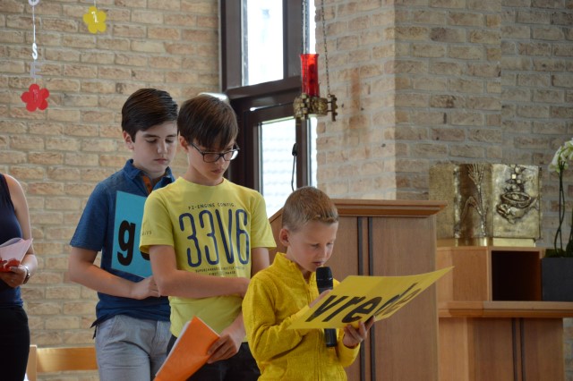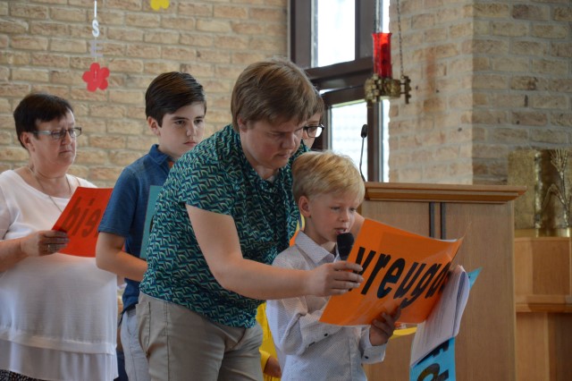 DANK-VIEREN OP HET PINKSTERFEEST. Een jeugdige, verfrissende dankviering sloot op Pinksteren (4 juni) de catechese voor vormelingen en eerstecommunicanten af. Ongedwongen – elk op zijn niveau - brachten zij hun teksten. Ook waren hier en daar de ouders en grootouders betrokken. Krachtig als de wind Het openingswoord was een dialoog tussen een eerstecommunicant en catechiste met het antwoord op de kinderlijk vraag naar de betekenis van het pinksterfeest. Het antwoord bestond uit een treffende beschrijving van de H. Geest: “…om te verstaan wie of wat de Geest is en wat Hij doet, moeten we eens denken aan de wind. De wind zelf kan je niet zien, niet vastpakken, net als de Geest. Wat de wind doet kunnen we wel zien; want die geeft kracht. Hij brengt takken en bladeren van bomen in beweging en laat de deuren en ramen dichtslaan. Zo geeft ook de Heilige Geest ons kracht. Hij kan ons in beweging brengen naar elkaar om veel goede dingen te doen, om te doen zoals Jezus.†Zeven gaven Enkele vormelingen dramatiseerden het verhaal van het eerste pinksterfeest. De woorden van de apostelen Petrus en Andreas klonken direct en bevattelijk. Of hoe je de ‘Handelingen der Apostelen’ tot leven kunt brengen. Verder stonden de voorbeden in het teken van ‘de zeven gaven’. Enkele kleintjes, enkele vormelingen, een moeder, een opa, een catechiste visualiseerden ze: Vreugde, Liefde, Goedheid, Vrede, Trouw, Geduld, Wijsheid… Elke stap is verklaring: ‘n hoera voor Jezus Na de communie lieten de vormelingen fier hun themaliedje ‘Elke stap’ horen, maar ook de eerste-communicantjes brachten ‘live’ hun ‘Hiep, hiep, hoera’-song. De oprechte respons én het applaus in de kerk van jong en iets ouder volk was een opsteker voor allen die instonden voor deze en voorbije vieringen. De receptie achteraf was dan ruim verdiend Voor een uitgebreid beeldverslag verwijzen wij naar www.dekenaat-ronse.be. Doorklikken naar St.-Pieter/Fotoalbum. St.-Pieter startpagina |