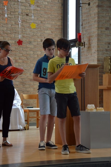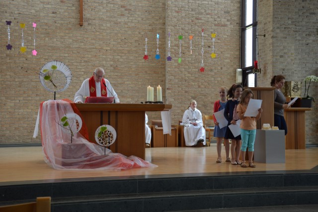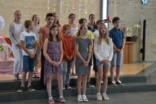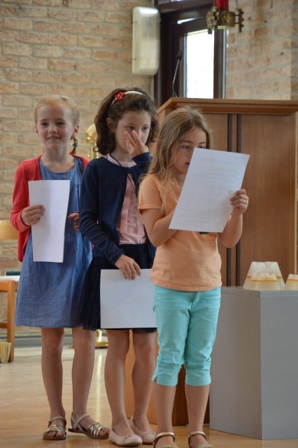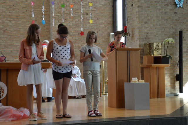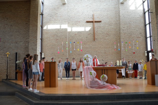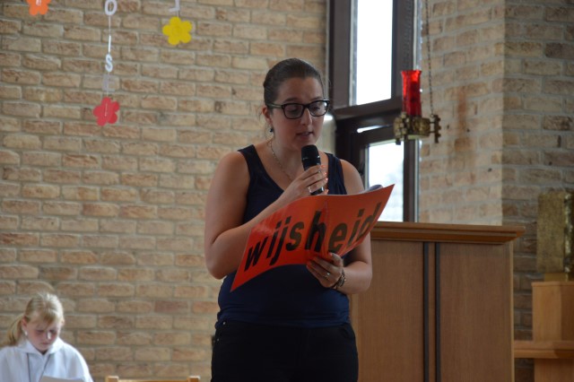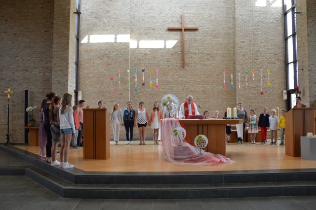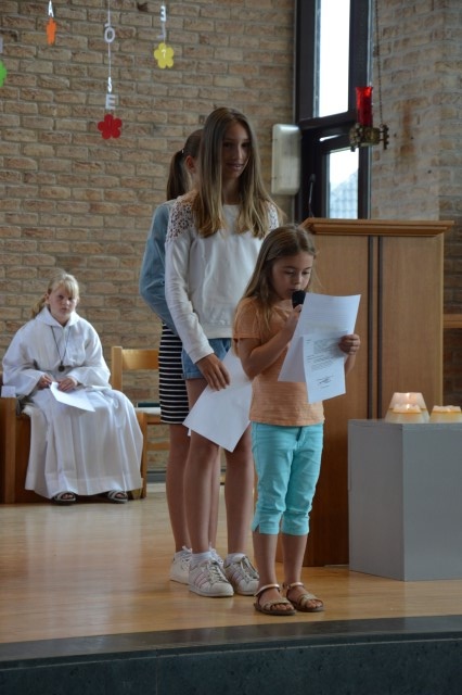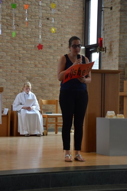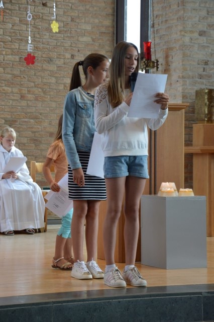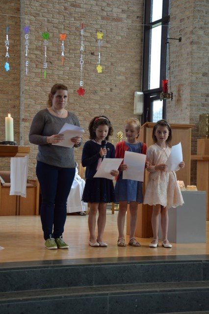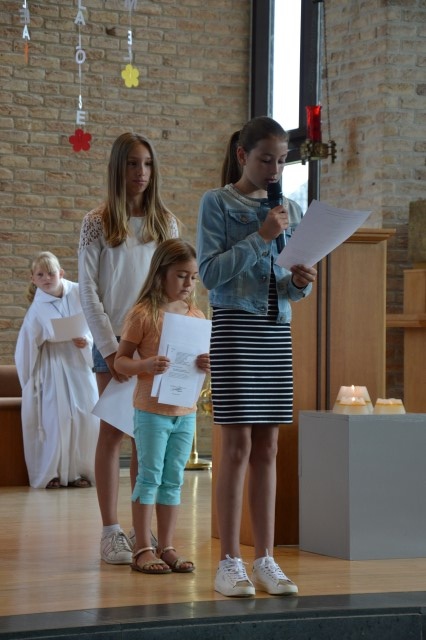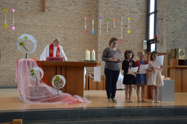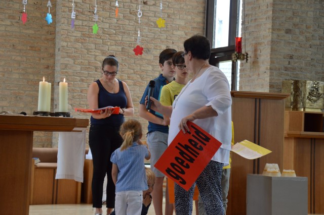 DANK-VIEREN OP HET PINKSTERFEEST. Een jeugdige, verfrissende dankviering sloot op Pinksteren (4 juni) de catechese voor vormelingen en eerstecommunicanten af. Ongedwongen – elk op zijn niveau - brachten zij hun teksten. Ook waren hier en daar de ouders en grootouders betrokken. Krachtig als de wind Het openingswoord was een dialoog tussen een eerstecommunicant en catechiste met het antwoord op de kinderlijk vraag naar de betekenis van het pinksterfeest. Het antwoord bestond uit een treffende beschrijving van de H. Geest: “…om te verstaan wie of wat de Geest is en wat Hij doet, moeten we eens denken aan de wind. De wind zelf kan je niet zien, niet vastpakken, net als de Geest. Wat de wind doet kunnen we wel zien; want die geeft kracht. Hij brengt takken en bladeren van bomen in beweging en laat de deuren en ramen dichtslaan. Zo geeft ook de Heilige Geest ons kracht. Hij kan ons in beweging brengen naar elkaar om veel goede dingen te doen, om te doen zoals Jezus.†Zeven gaven Enkele vormelingen dramatiseerden het verhaal van het eerste pinksterfeest. De woorden van de apostelen Petrus en Andreas klonken direct en bevattelijk. Of hoe je de ‘Handelingen der Apostelen’ tot leven kunt brengen. Verder stonden de voorbeden in het teken van ‘de zeven gaven’. Enkele kleintjes, enkele vormelingen, een moeder, een opa, een catechiste visualiseerden ze: Vreugde, Liefde, Goedheid, Vrede, Trouw, Geduld, Wijsheid… Elke stap is verklaring: ‘n hoera voor Jezus Na de communie lieten de vormelingen fier hun themaliedje ‘Elke stap’ horen, maar ook de eerste-communicantjes brachten ‘live’ hun ‘Hiep, hiep, hoera’-song. De oprechte respons én het applaus in de kerk van jong en iets ouder volk was een opsteker voor allen die instonden voor deze en voorbije vieringen. De receptie achteraf was dan ruim verdiend Voor een uitgebreid beeldverslag verwijzen wij naar www.dekenaat-ronse.be. Doorklikken naar St.-Pieter/Fotoalbum. St.-Pieter startpagina |