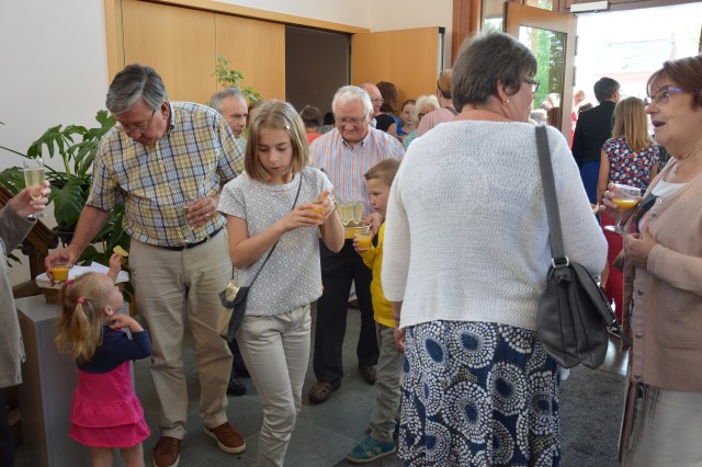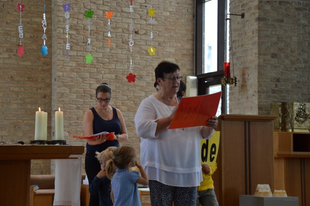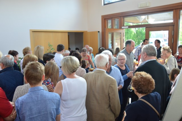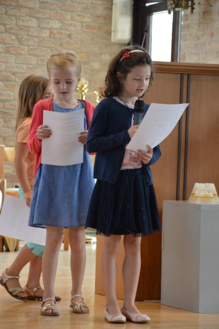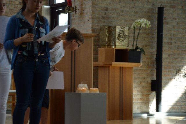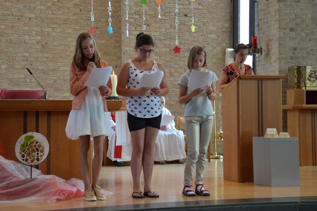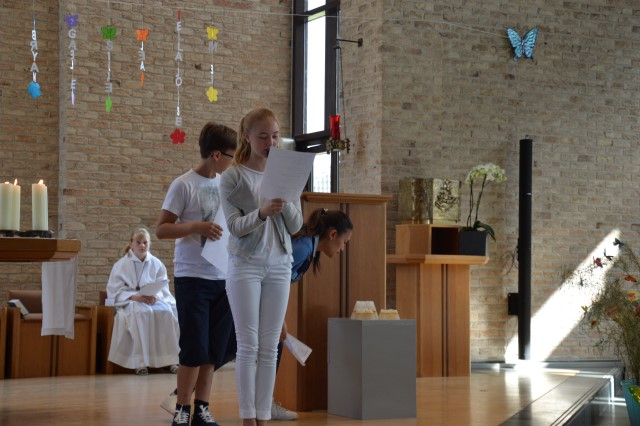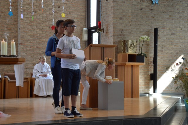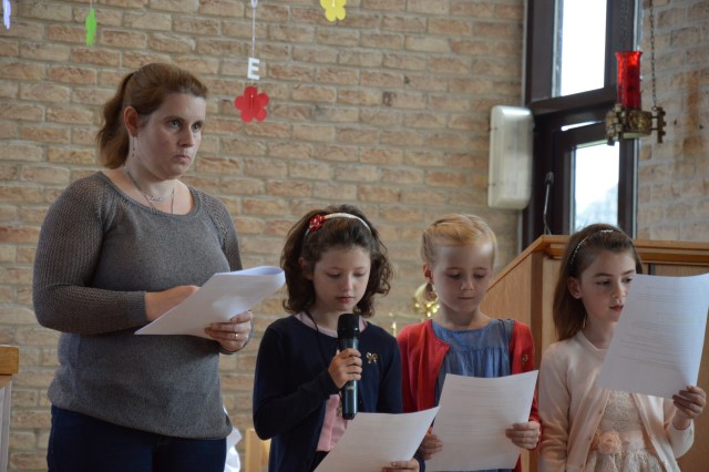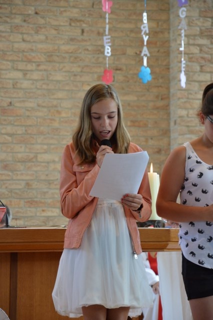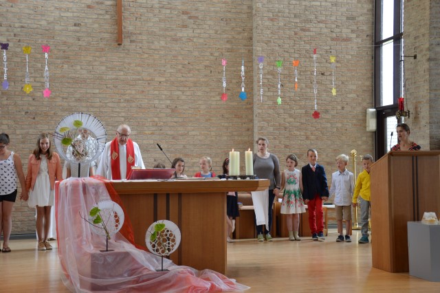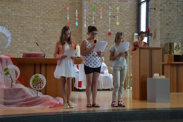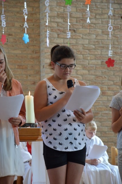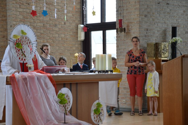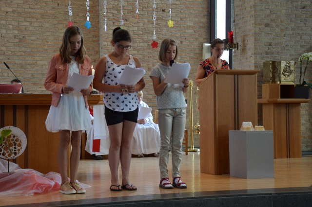 DANK-VIEREN OP HET PINKSTERFEEST. Een jeugdige, verfrissende dankviering sloot op Pinksteren (4 juni) de catechese voor vormelingen en eerstecommunicanten af. Ongedwongen – elk op zijn niveau - brachten zij hun teksten. Ook waren hier en daar de ouders en grootouders betrokken. Krachtig als de wind Het openingswoord was een dialoog tussen een eerstecommunicant en catechiste met het antwoord op de kinderlijk vraag naar de betekenis van het pinksterfeest. Het antwoord bestond uit een treffende beschrijving van de H. Geest: “…om te verstaan wie of wat de Geest is en wat Hij doet, moeten we eens denken aan de wind. De wind zelf kan je niet zien, niet vastpakken, net als de Geest. Wat de wind doet kunnen we wel zien; want die geeft kracht. Hij brengt takken en bladeren van bomen in beweging en laat de deuren en ramen dichtslaan. Zo geeft ook de Heilige Geest ons kracht. Hij kan ons in beweging brengen naar elkaar om veel goede dingen te doen, om te doen zoals Jezus.†Zeven gaven Enkele vormelingen dramatiseerden het verhaal van het eerste pinksterfeest. De woorden van de apostelen Petrus en Andreas klonken direct en bevattelijk. Of hoe je de ‘Handelingen der Apostelen’ tot leven kunt brengen. Verder stonden de voorbeden in het teken van ‘de zeven gaven’. Enkele kleintjes, enkele vormelingen, een moeder, een opa, een catechiste visualiseerden ze: Vreugde, Liefde, Goedheid, Vrede, Trouw, Geduld, Wijsheid… Elke stap is verklaring: ‘n hoera voor Jezus Na de communie lieten de vormelingen fier hun themaliedje ‘Elke stap’ horen, maar ook de eerste-communicantjes brachten ‘live’ hun ‘Hiep, hiep, hoera’-song. De oprechte respons én het applaus in de kerk van jong en iets ouder volk was een opsteker voor allen die instonden voor deze en voorbije vieringen. De receptie achteraf was dan ruim verdiend Voor een uitgebreid beeldverslag verwijzen wij naar www.dekenaat-ronse.be. Doorklikken naar St.-Pieter/Fotoalbum. St.-Pieter startpagina |